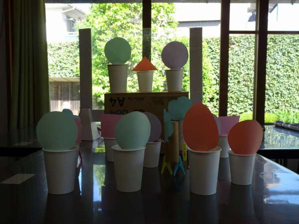 自分で作ったゴム鉄砲で、的に当てて、お父様お母様景品を
