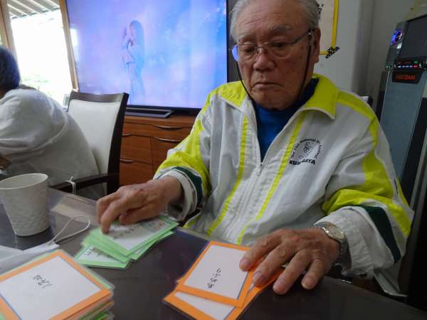 各テーブルに、歌の題名が書いてあるカードを置きます