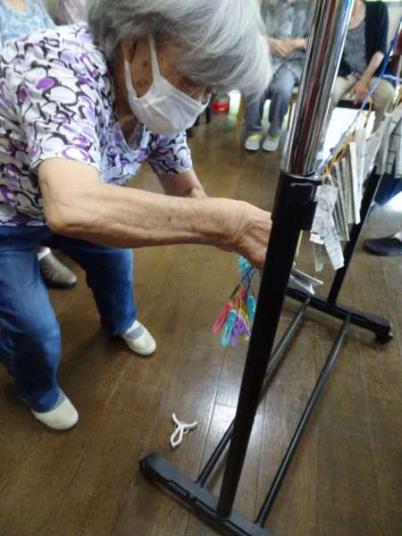お母さん、ゴムのついたおもりをスーっと棒に入れていきます