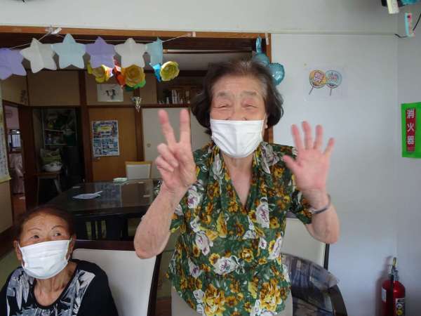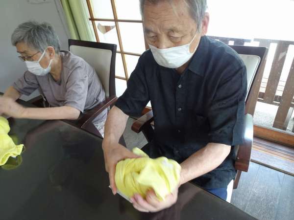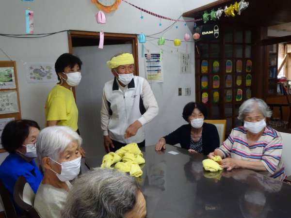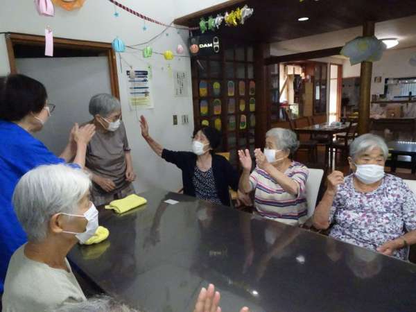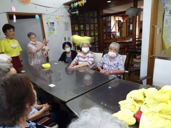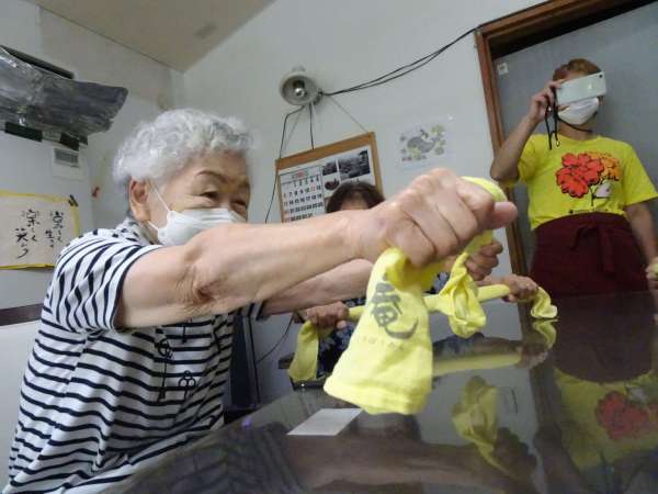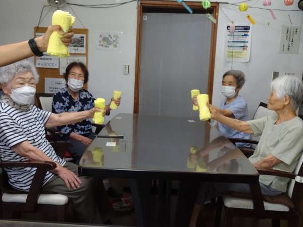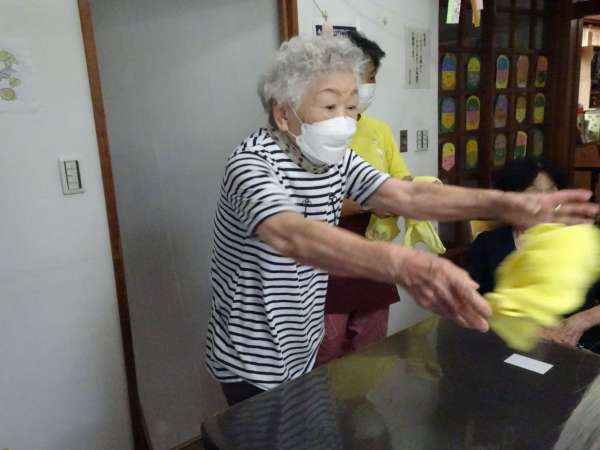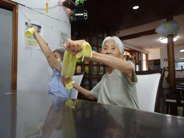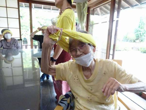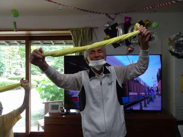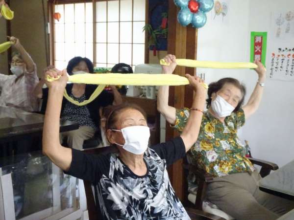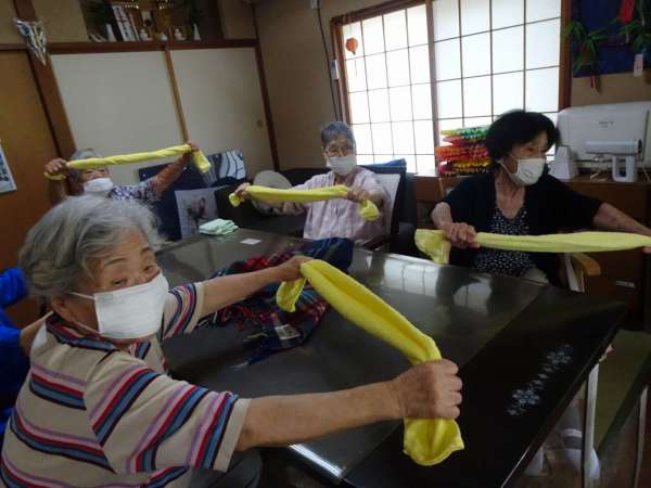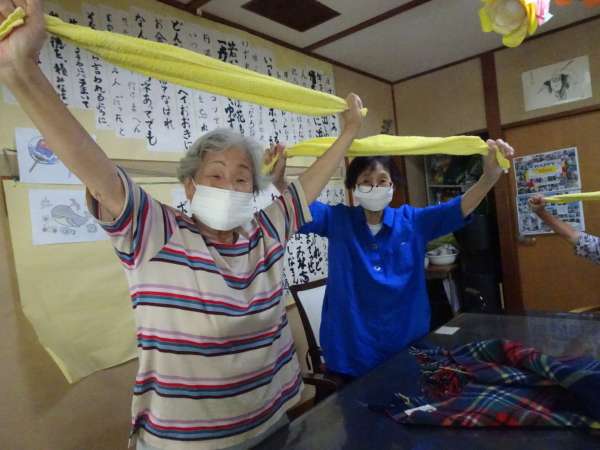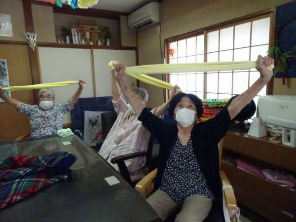 さて、お次の体操は両端をもって上に上に背筋を伸ばしていきましょう