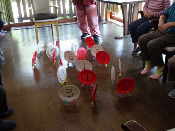 紅白に分けた紙皿に点数を描き、バラバラにおきます(*^。^*)