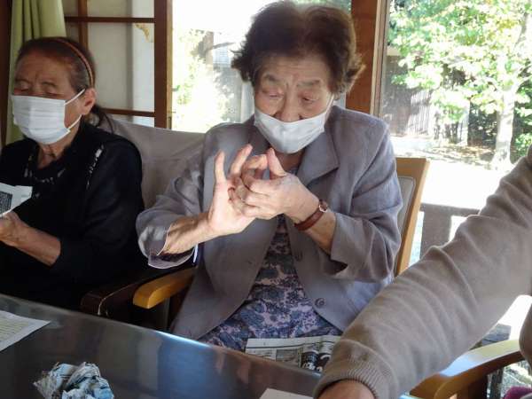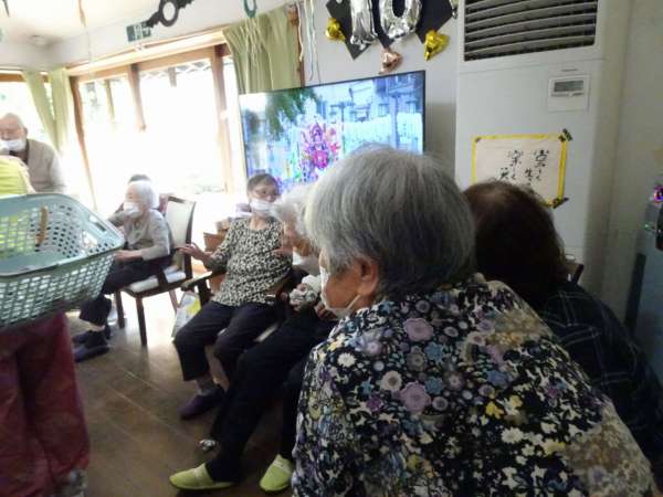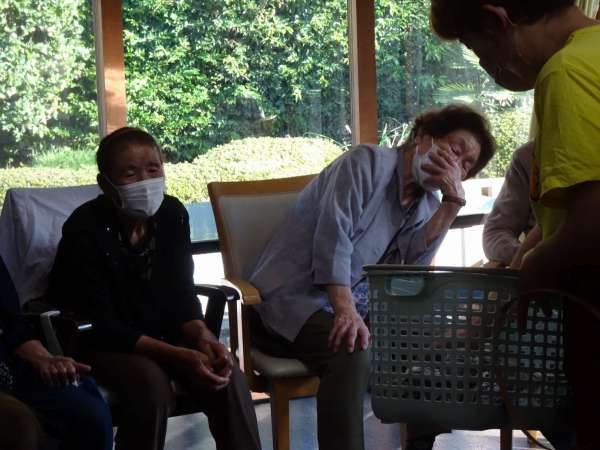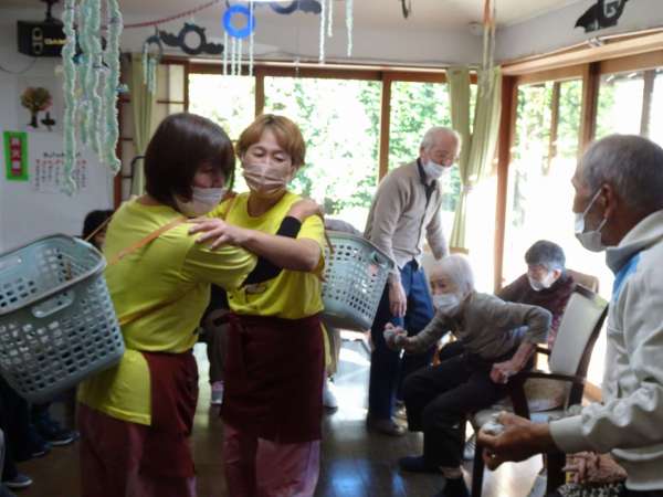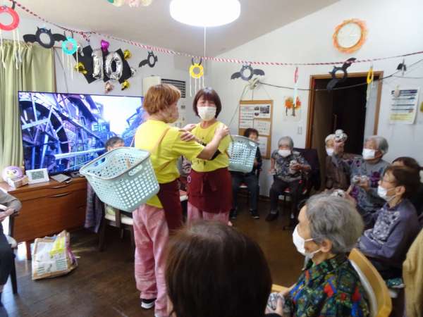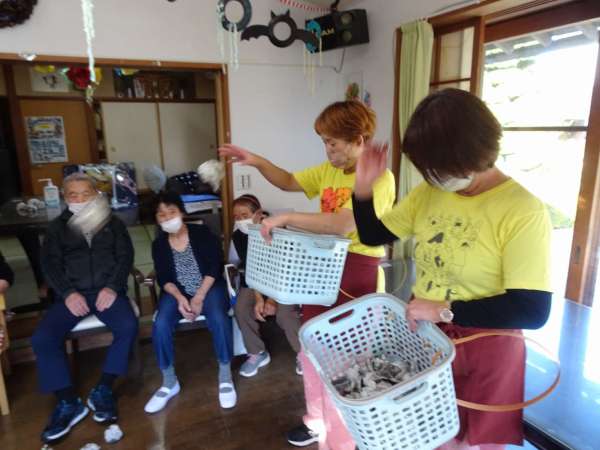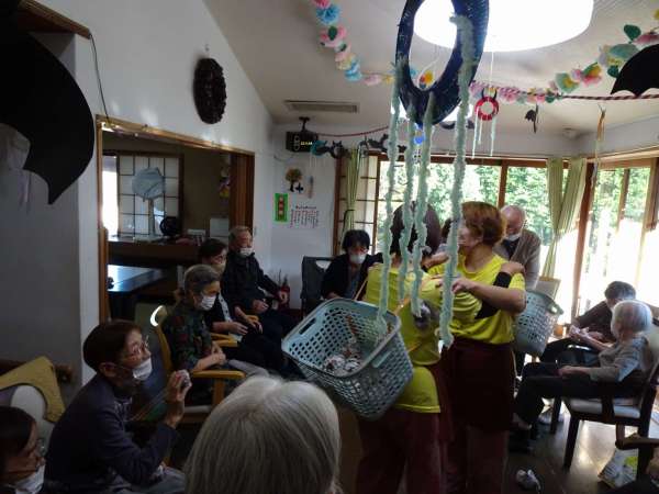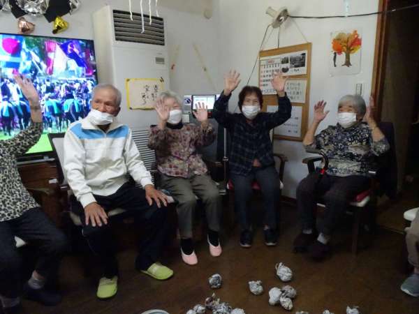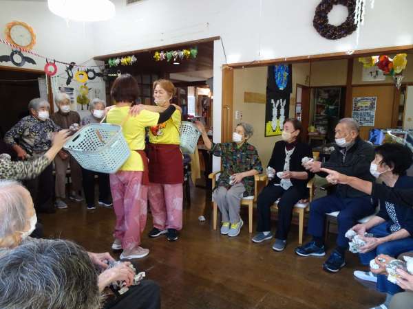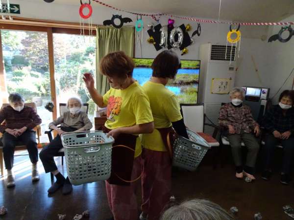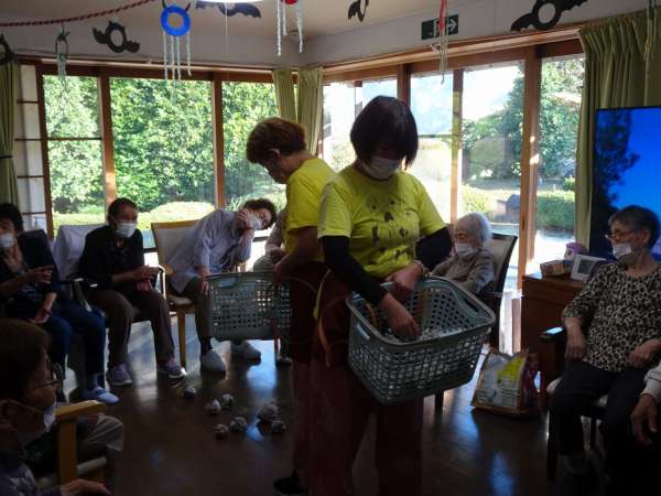 秋晴れの今日のレクリエーションは、玉入れでーす