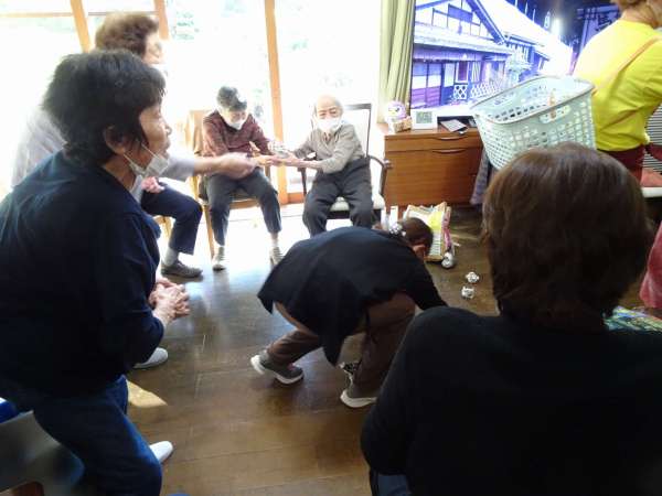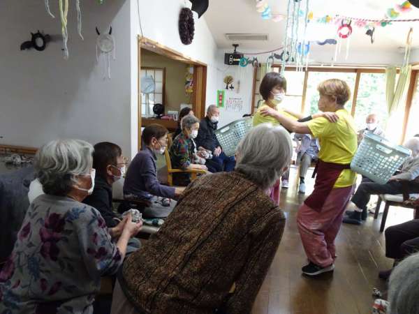 続いては、立っているスタッフのカゴに、玉入れです