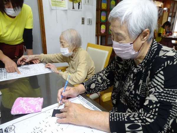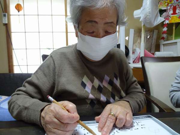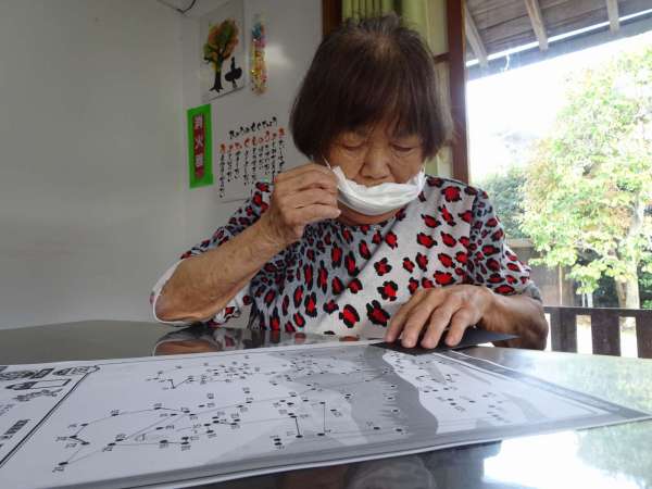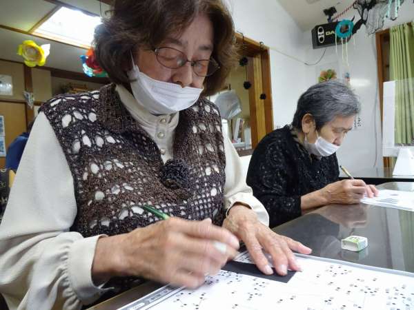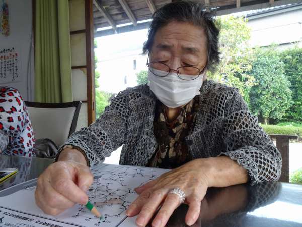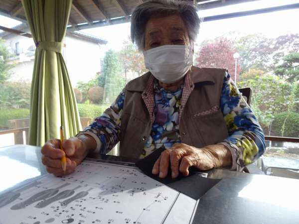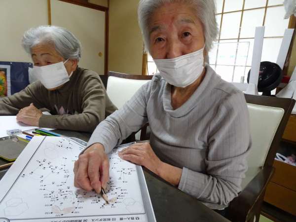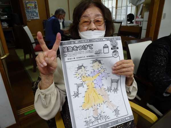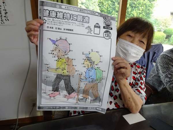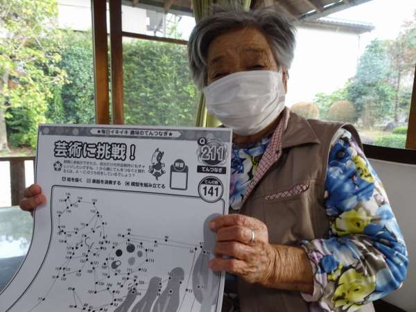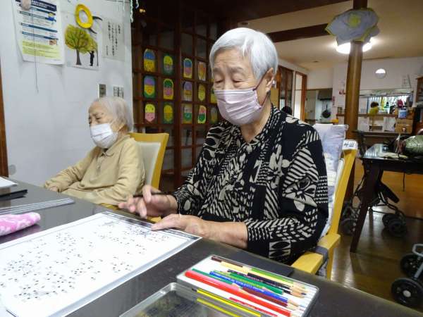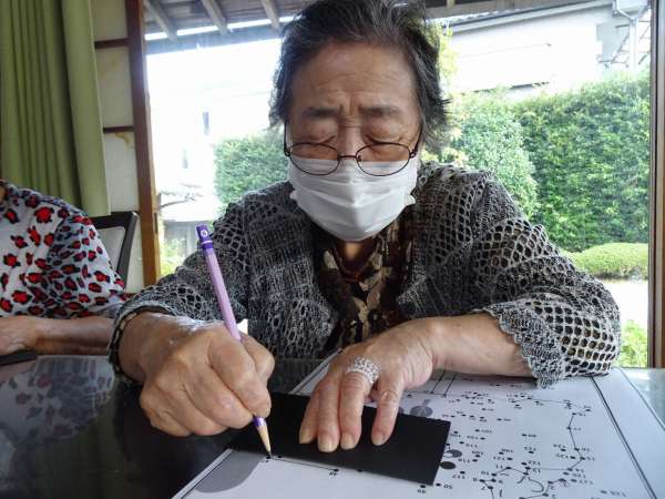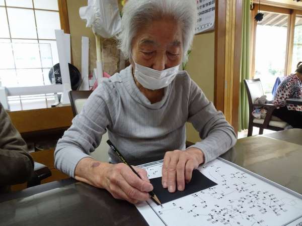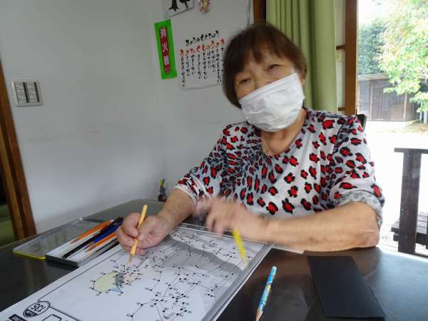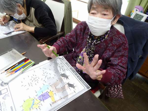 お母様、点つなぎで出来上がったアートを、色付けしていきます