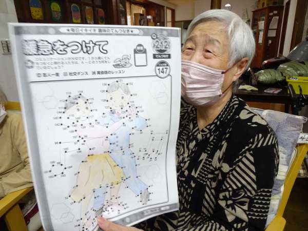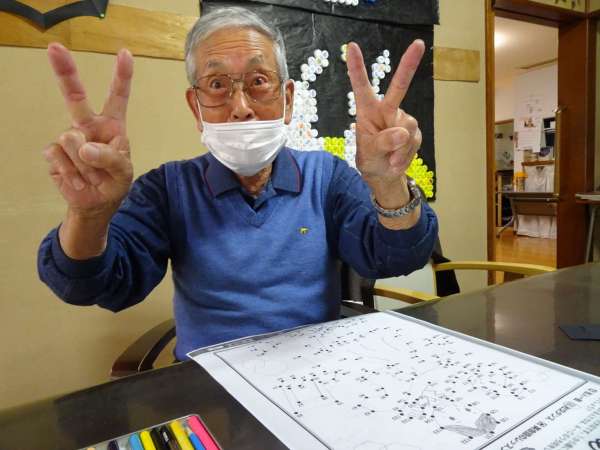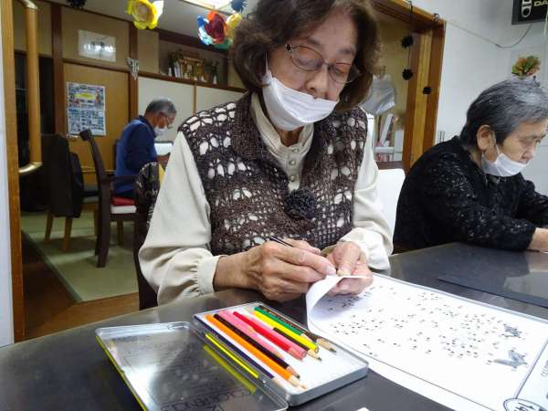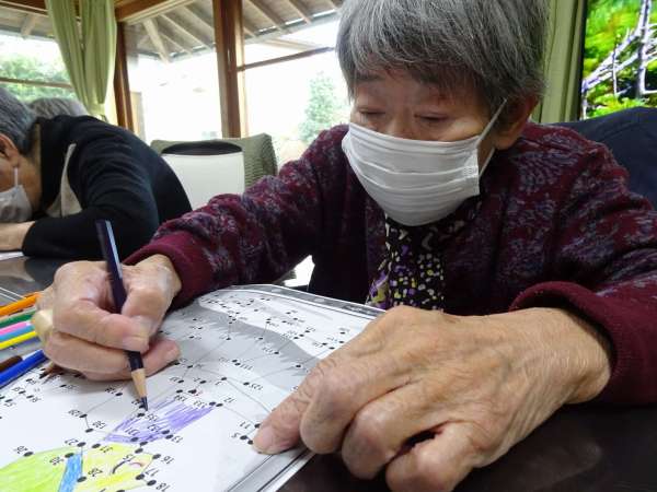 数字を数えて点をつなぎ、見えてきたものが何か考えて、そして色を塗りました