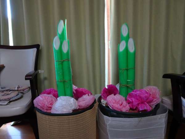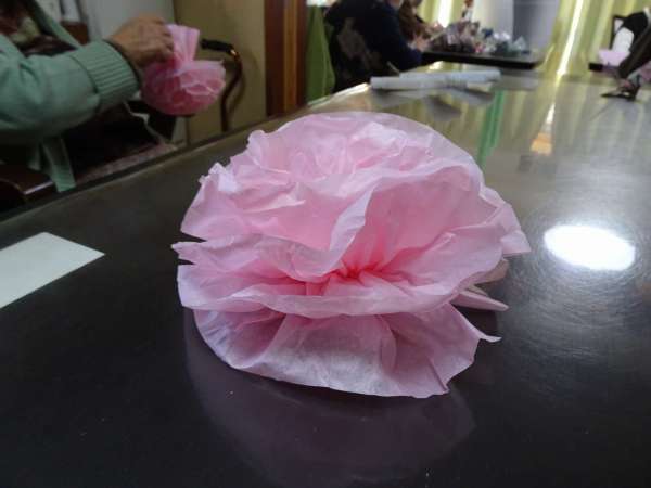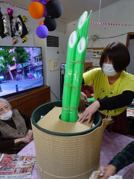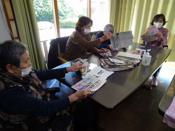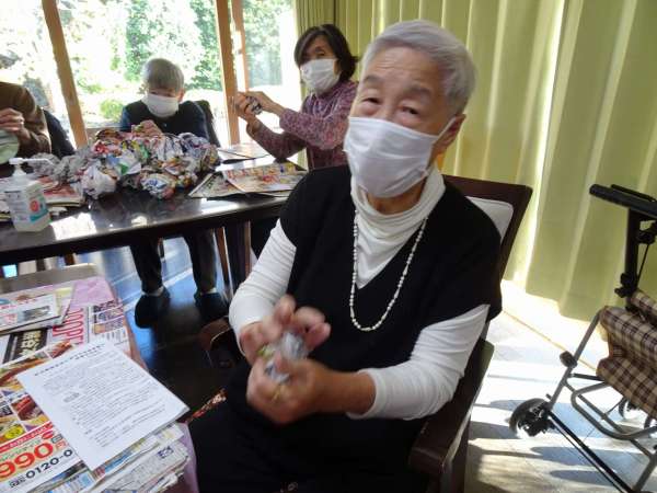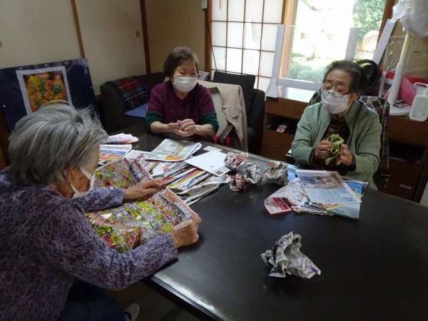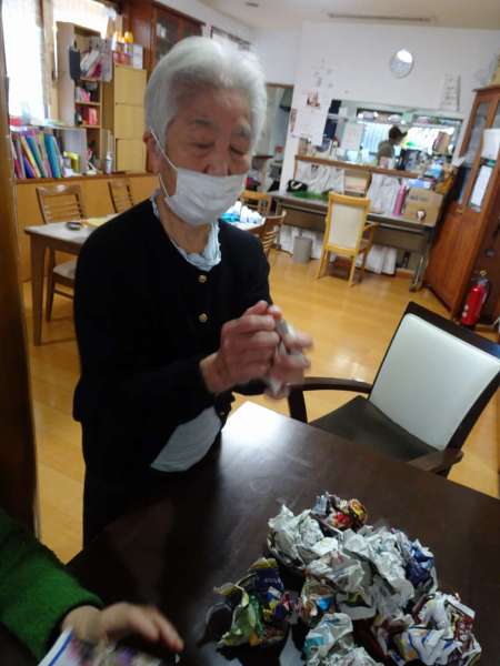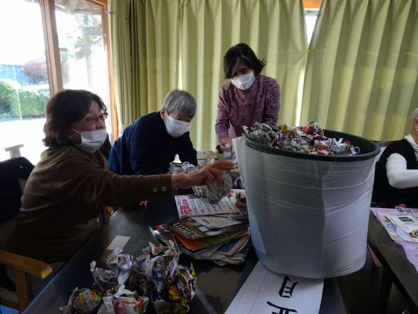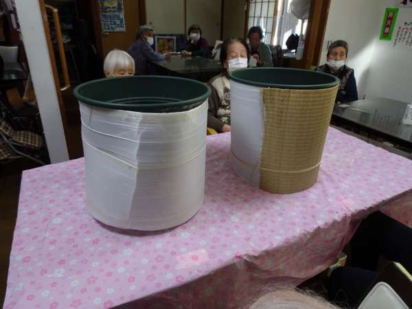 お母様方には、新聞・広告で樽の詰め物を作って頂いております