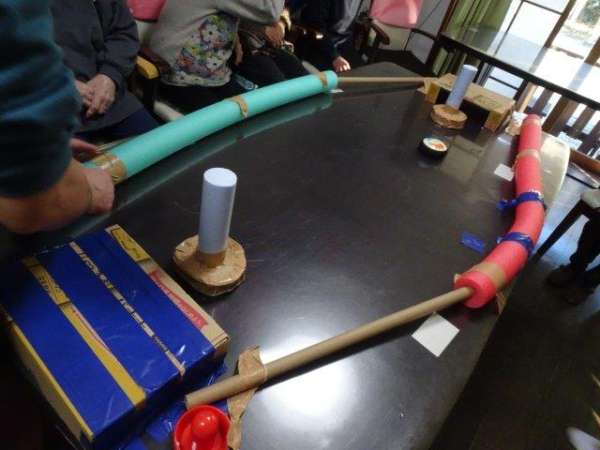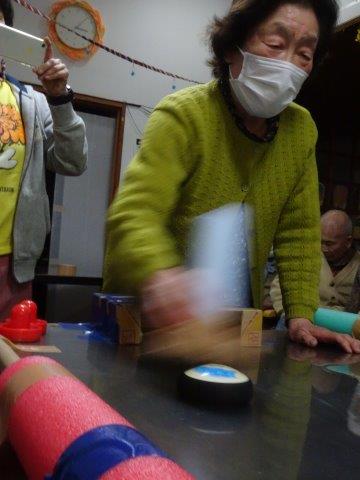 手作りのテーブルホッケーで、お父様お母様、頑張りまーす手 (グー)