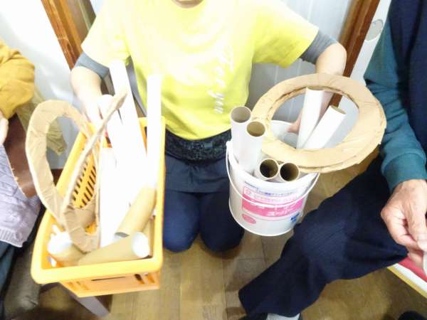 トイレットペーパーの芯やラップの芯、輪投げの輪など穴の開いているものばかり・・・