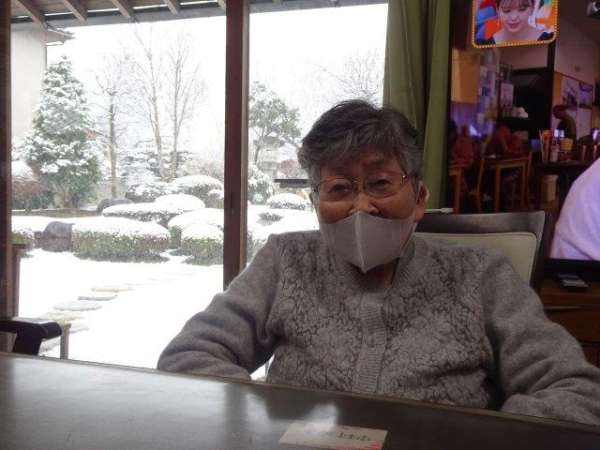 御待ちの間、雪景色を背景にパシャ