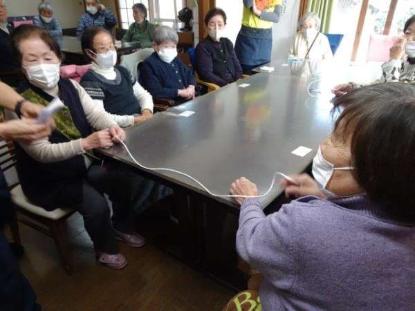 あちらとこちらに分かれて紐を引き合い、お互いに引っ張った同志で