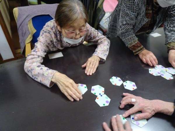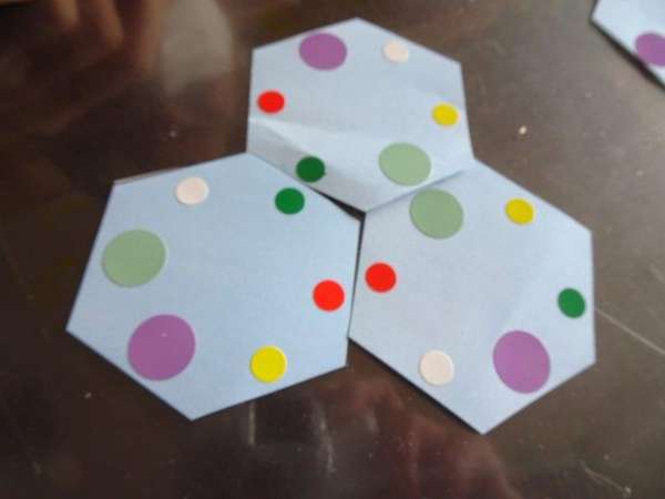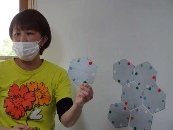 六角の辺にそれぞれ違ったマークかシールを貼り、それを合わせていくというパズルでするんるん (音符)