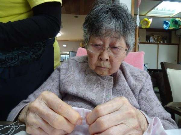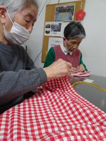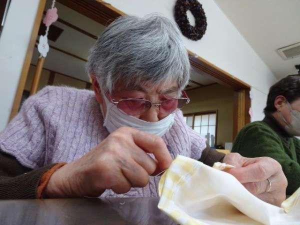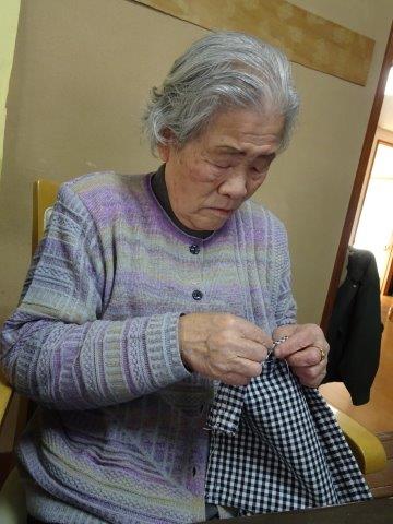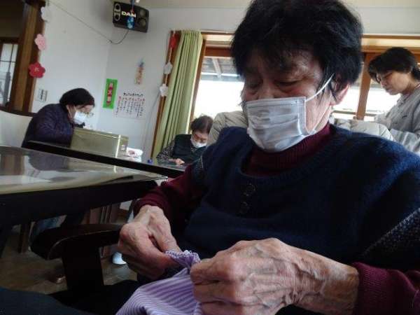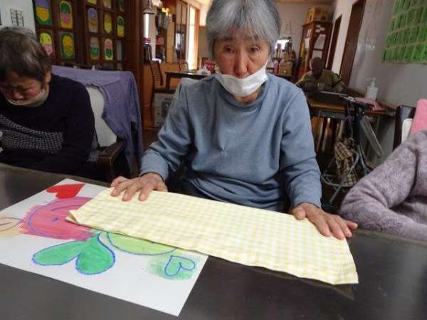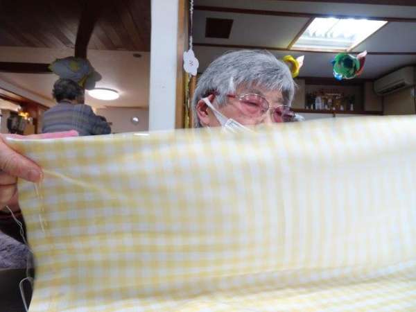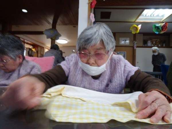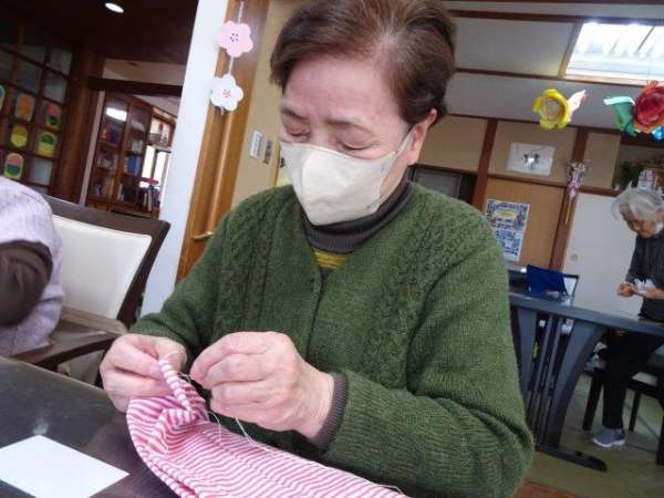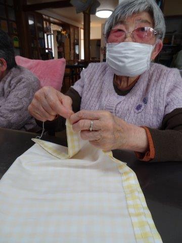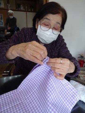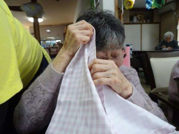 今日のレクリエーションは、お父様お母様にお裁縫をしていただきまーすわーい (嬉しい顔)