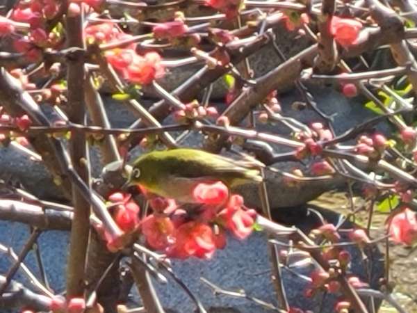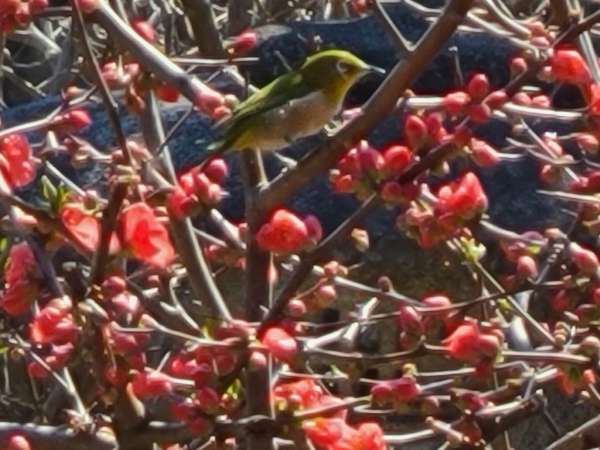 お庭のボケの花が咲き始めて、春を告げる鳥「メジロ」が近くまでご挨拶に来てくれました(#^^#)