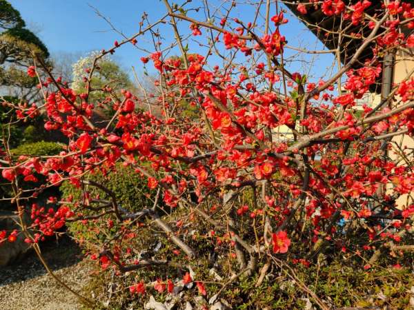 ホールからは、メジロなどの野鳥が遊びに来る木瓜も満開です👏