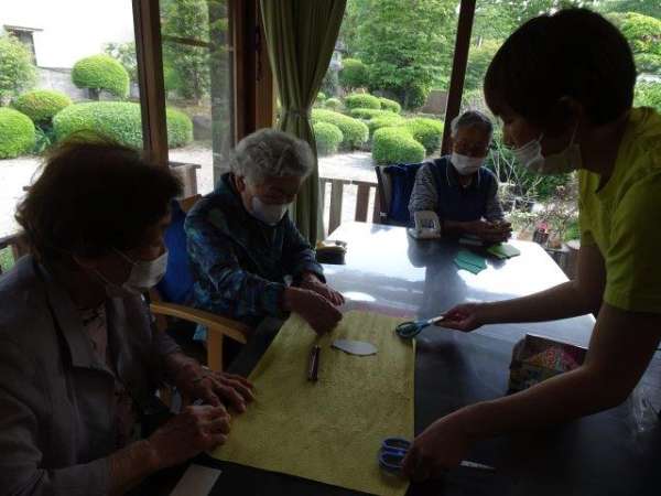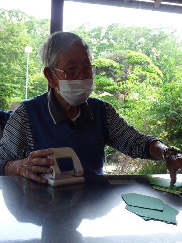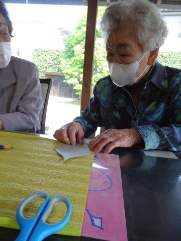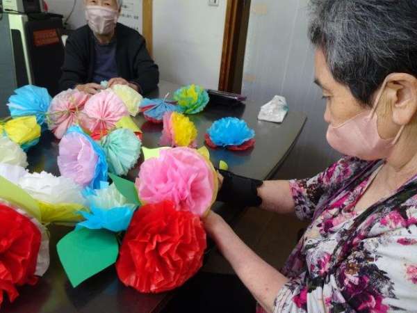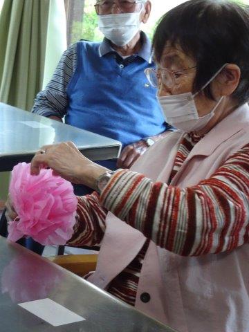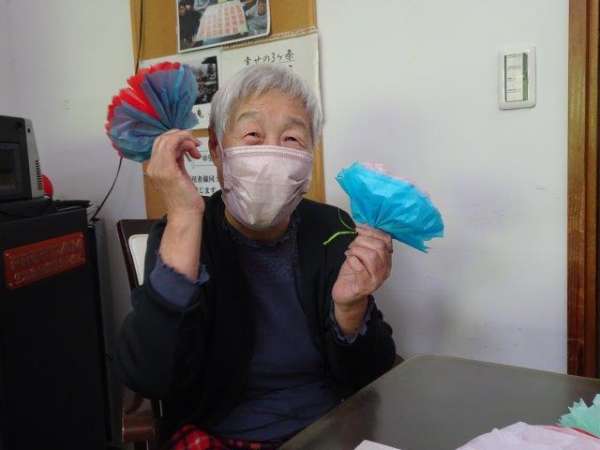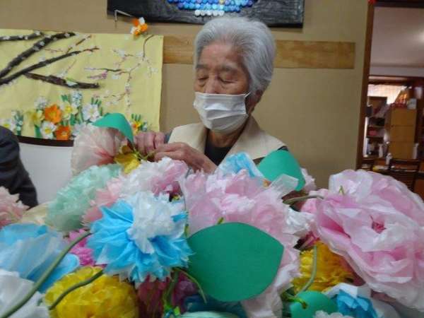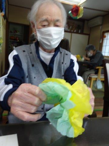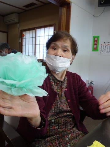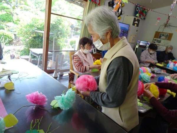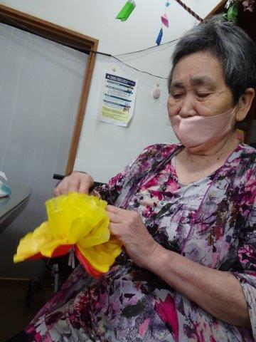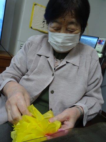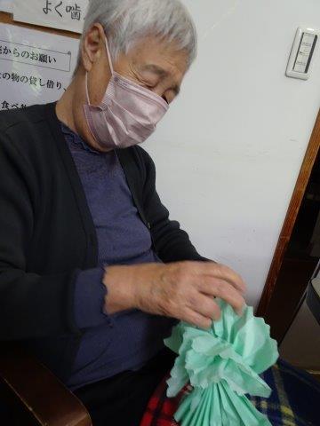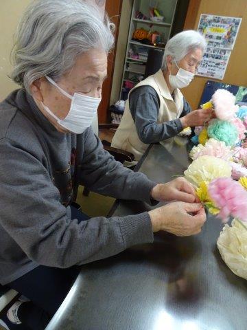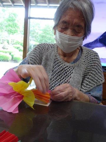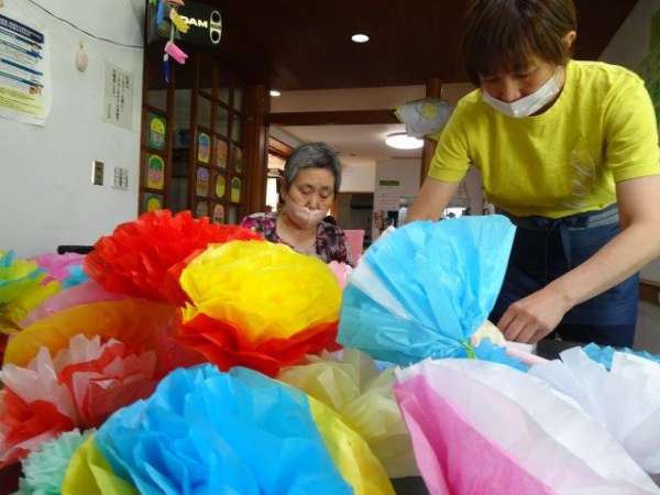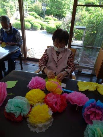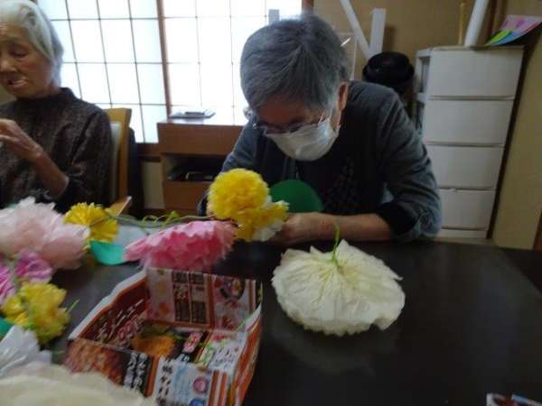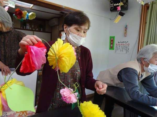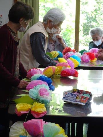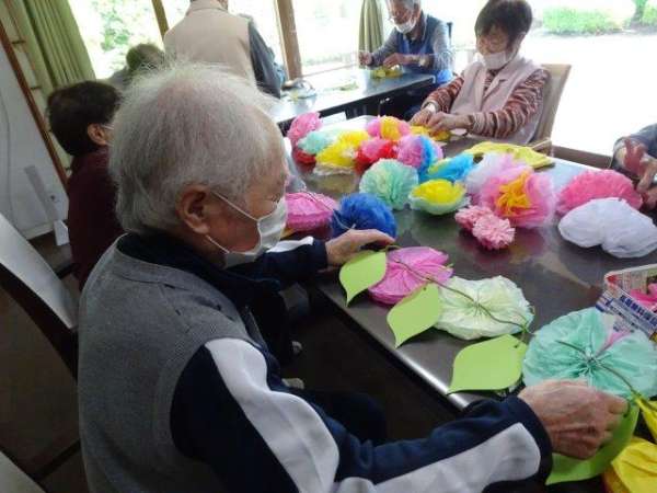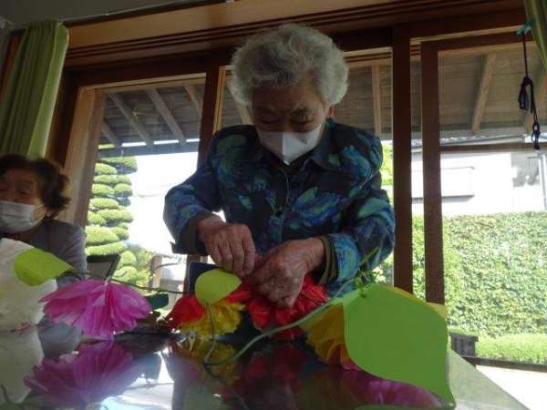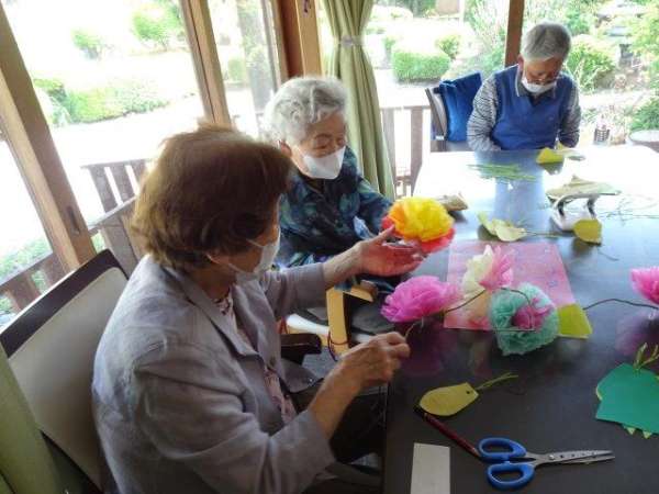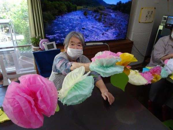 あるスタッフがレクリエーションの中で天井に飾るお花を皆様と作りました💐