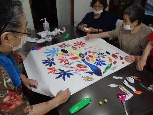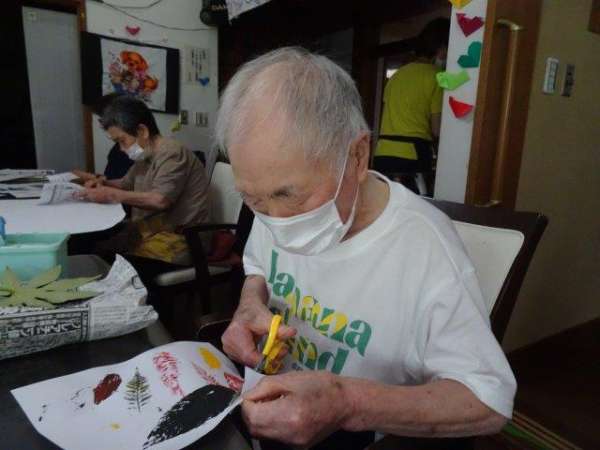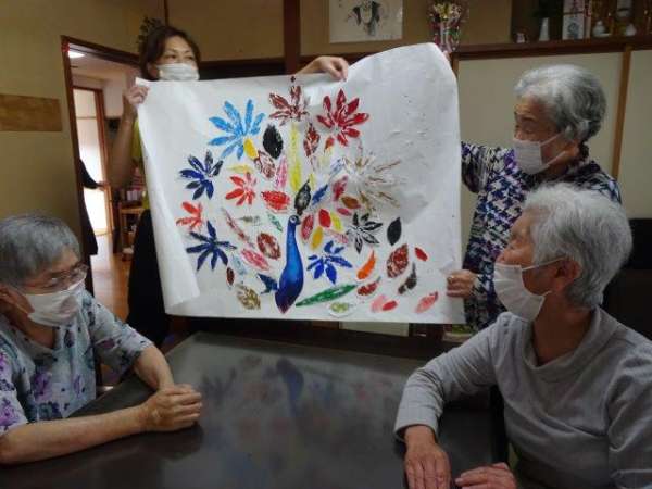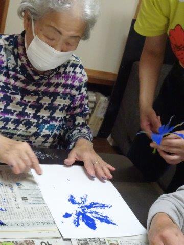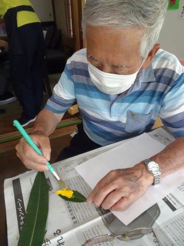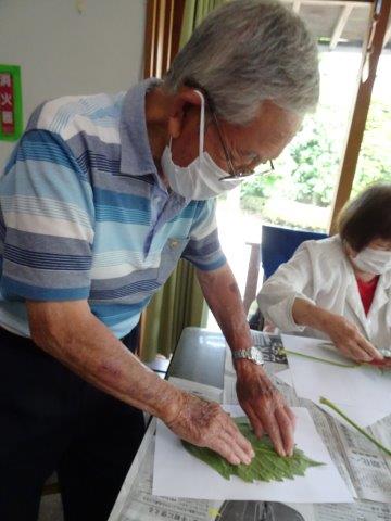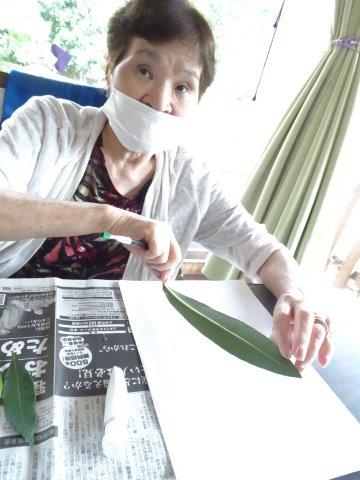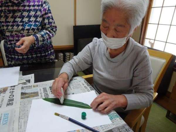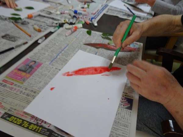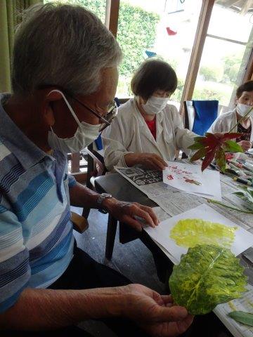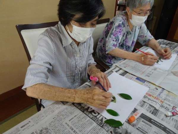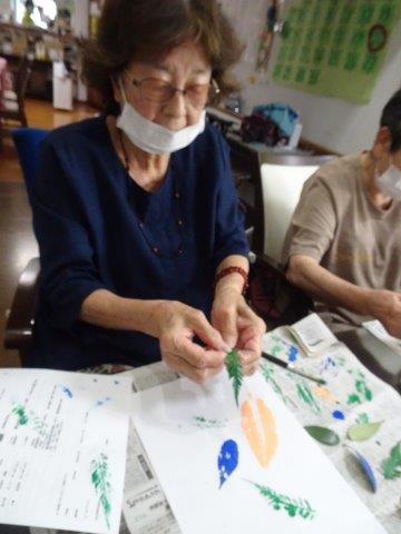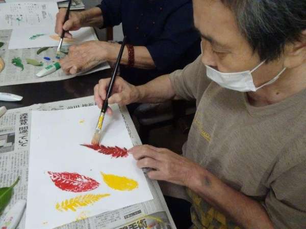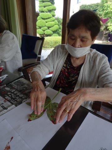 葉っぱに絵の具を付けて紙に形をとって頂いております