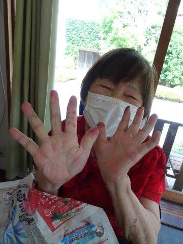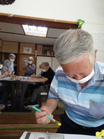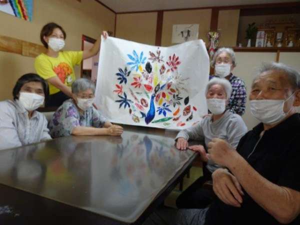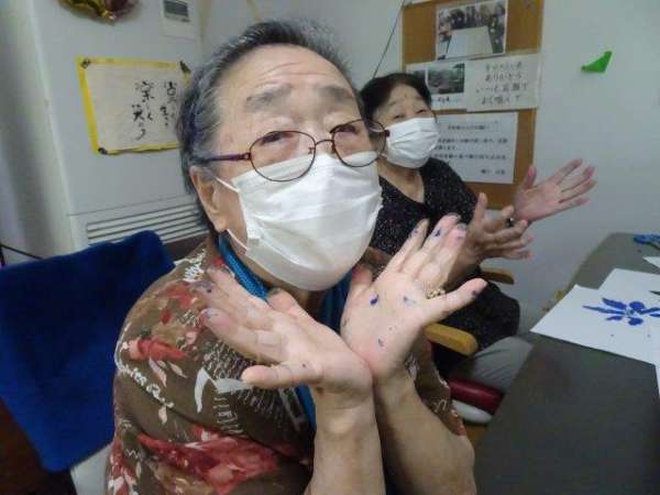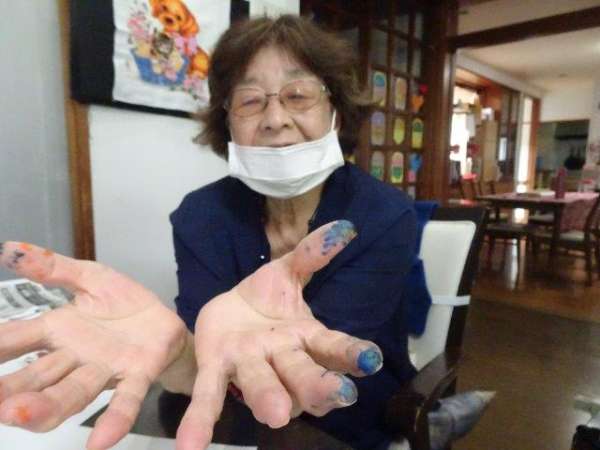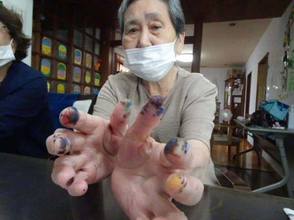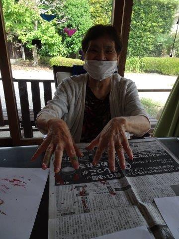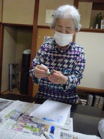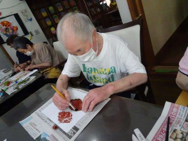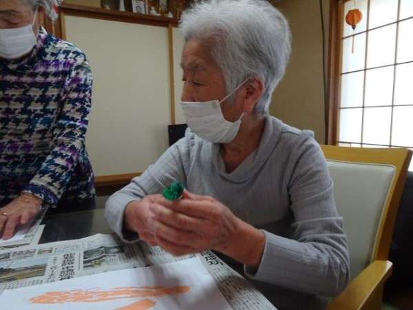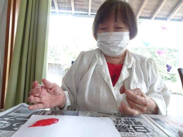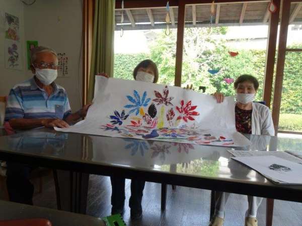 葉っぱに絵の具を付けて紙に形をとって頂いております