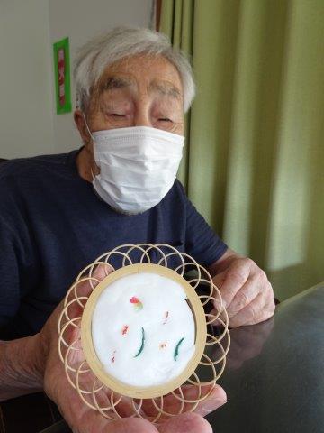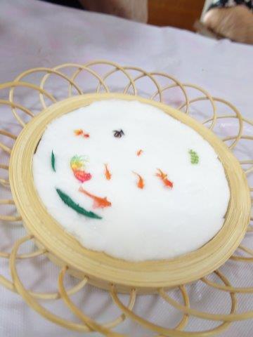 平らになりましたらその上に金魚シールやお手製の草を乗せて飾りつけです