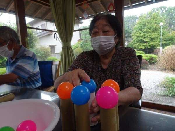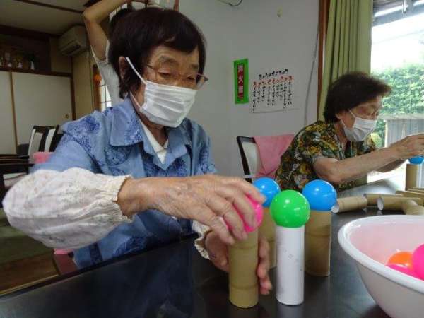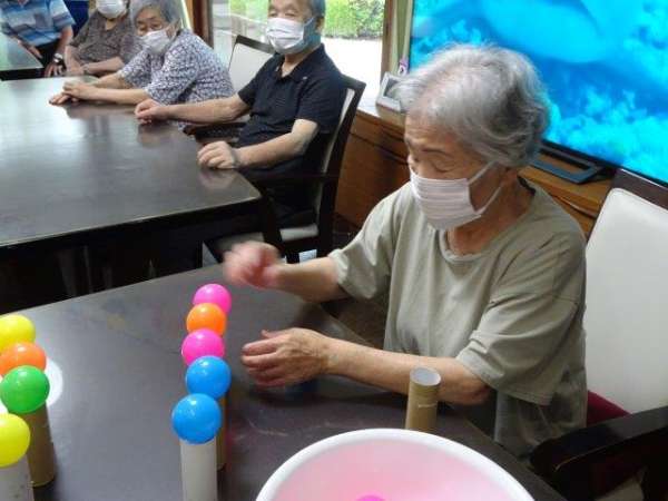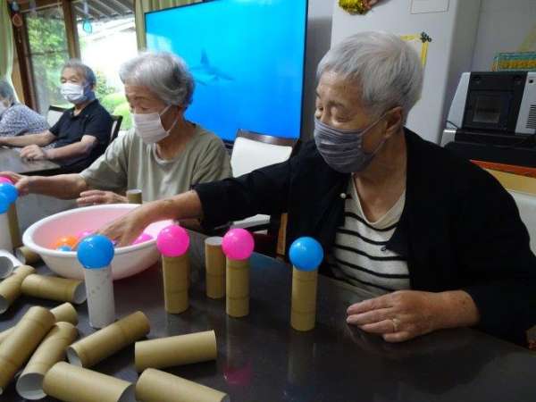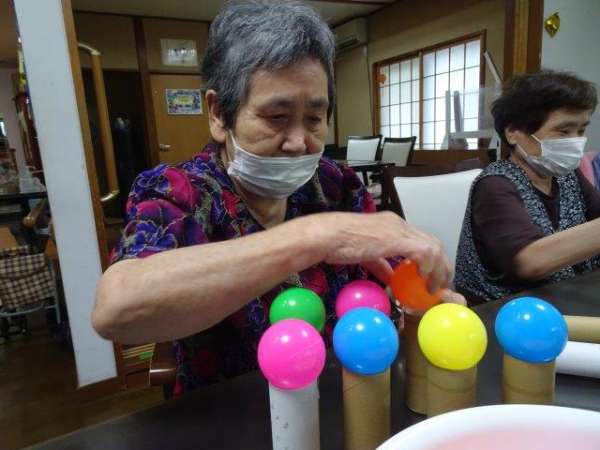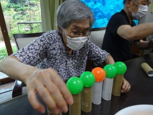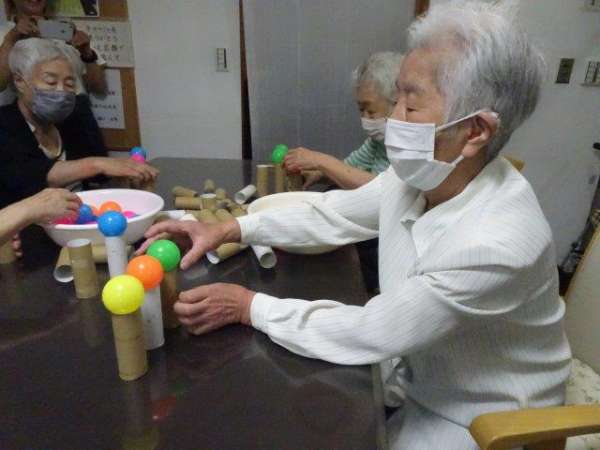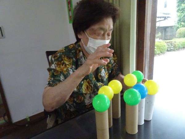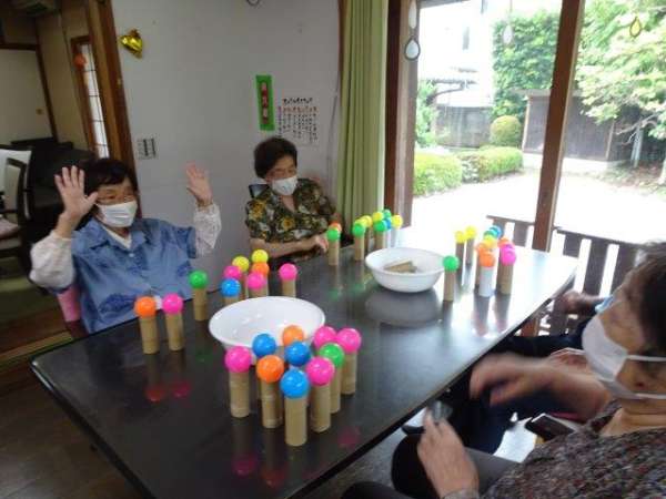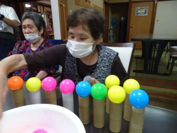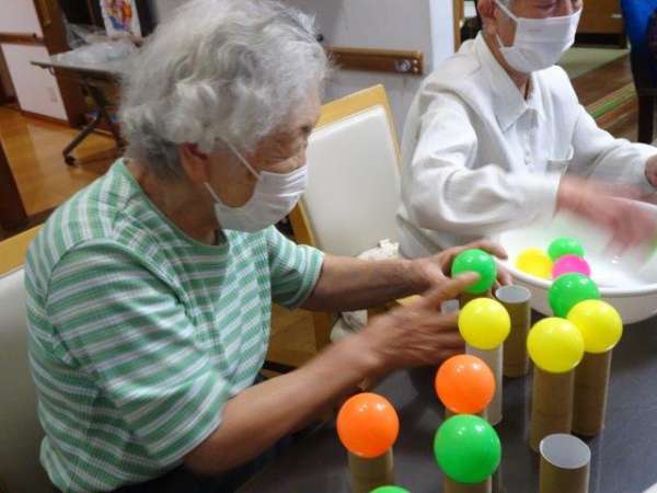 トイレットペーパーの芯にカラーボールを乗せていくだけの、これまた簡単ルールのゲーム