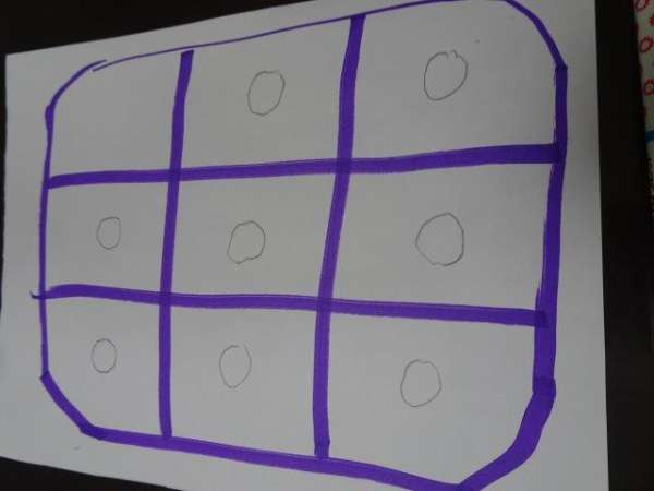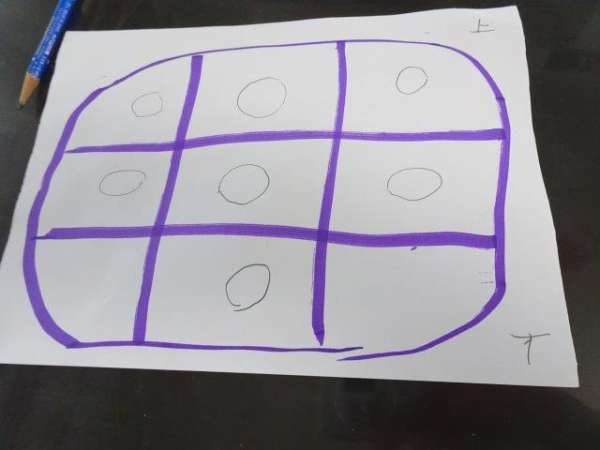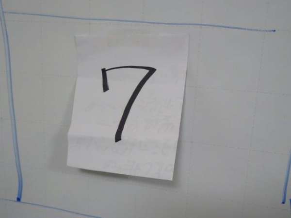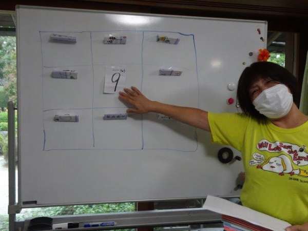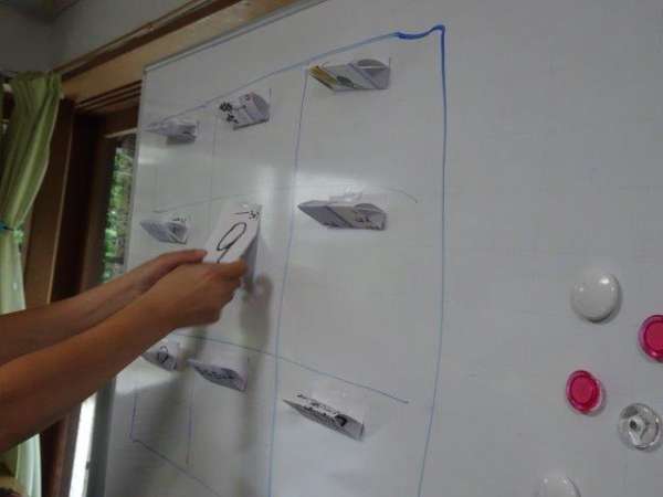 ホワイトボードのマスに、番号が書かれた紙が貼ってあります