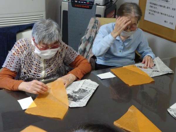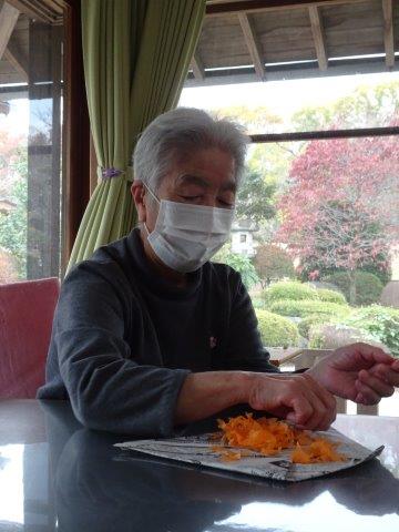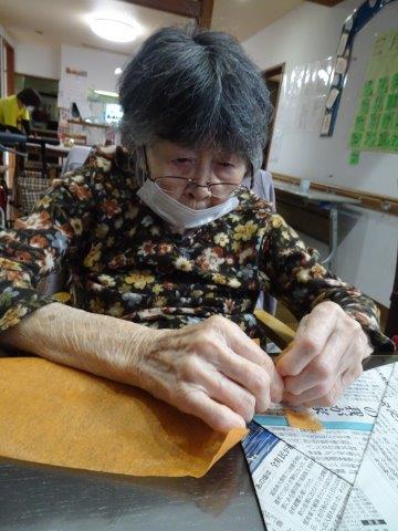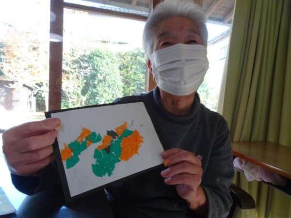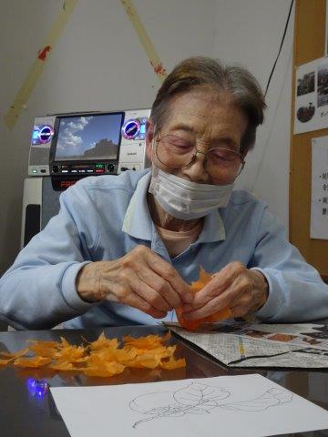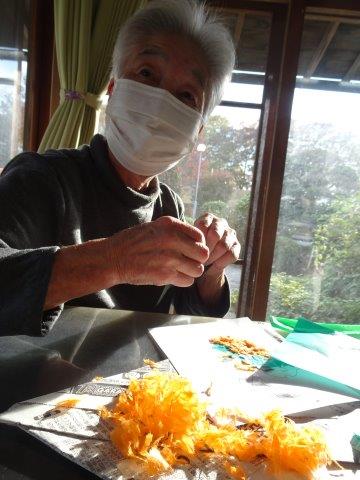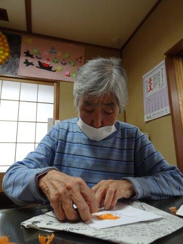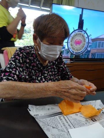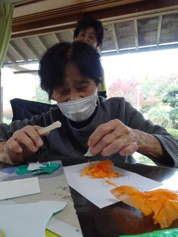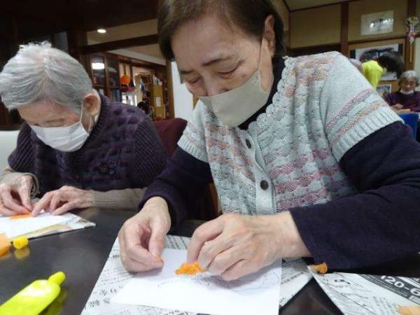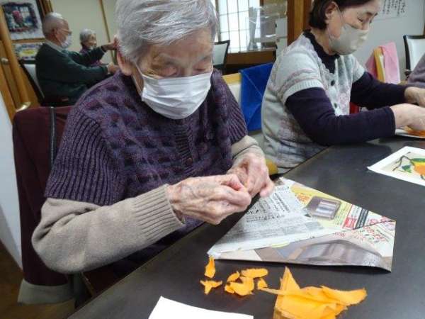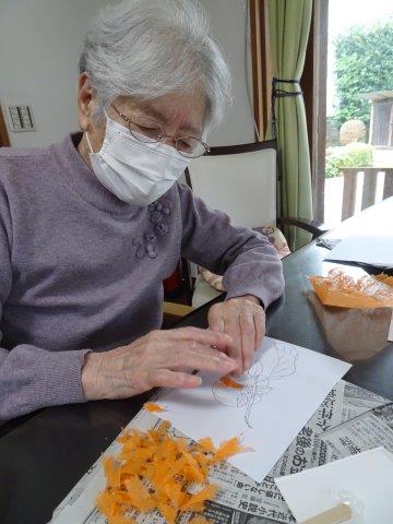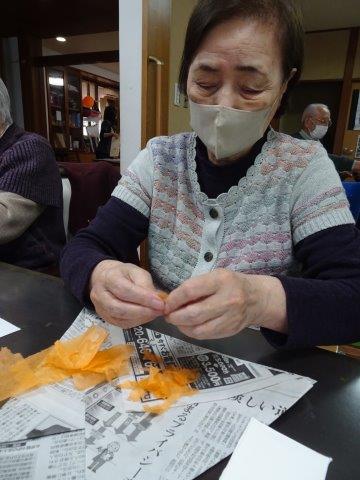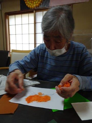 まずは、柿に貼り付けるオレンジ色のお花紙をちぎって頂きましょうわーい (嬉しい顔)