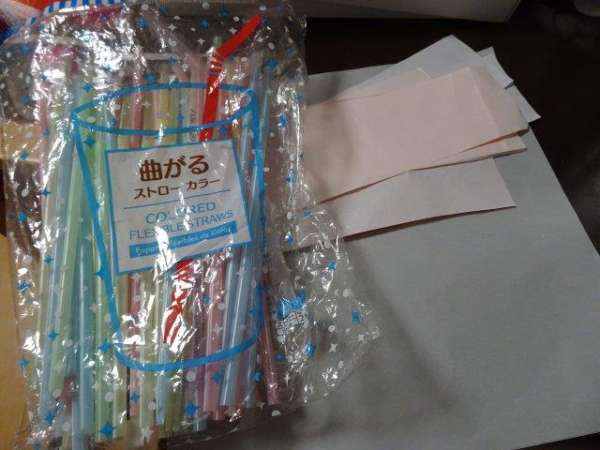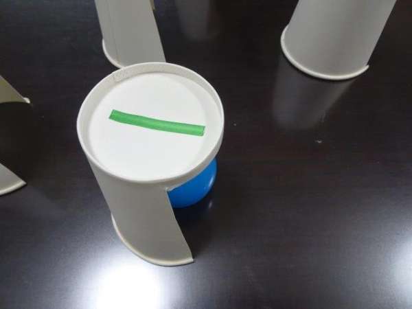 ④片方をテープでふさぎ、もう片方にストローを刺して、テープでしっかりと止めます(この時にストローの曲がる部分はカットして大丈夫です)