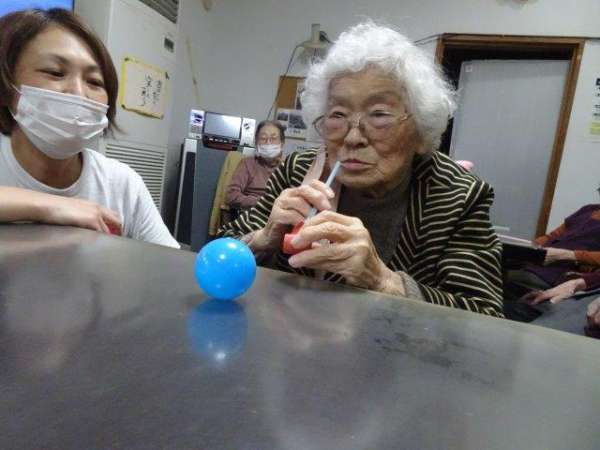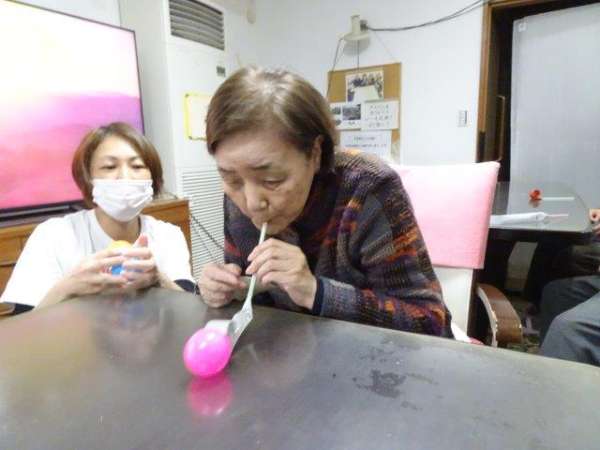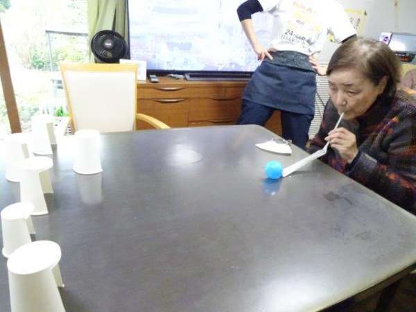 カラーボールを吹いた力で押して。。。