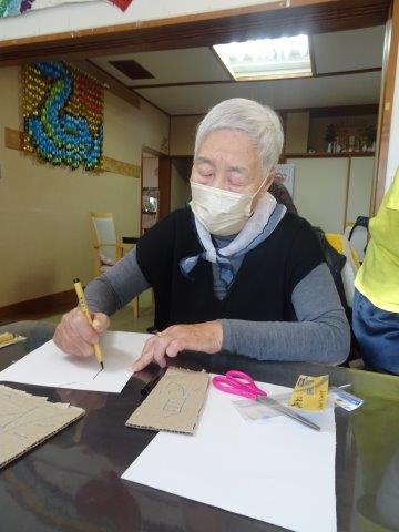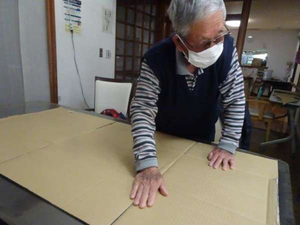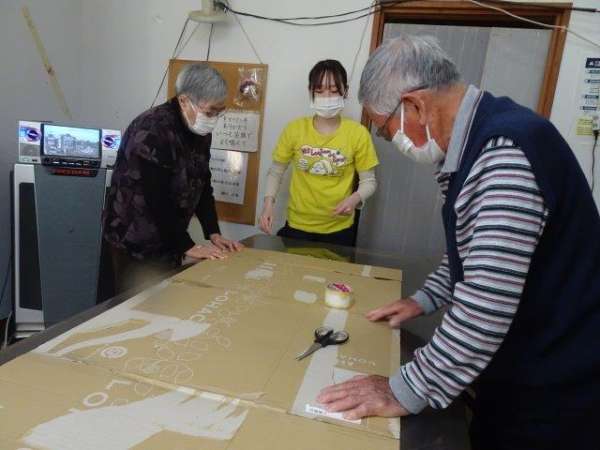段ボールを絵馬の形に型どって貼っていきます