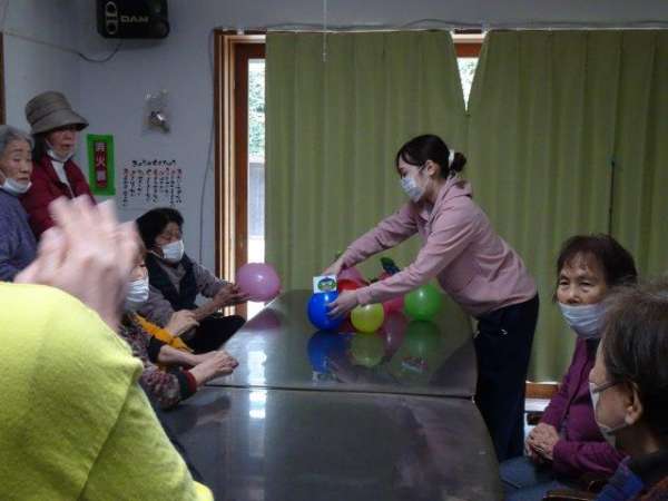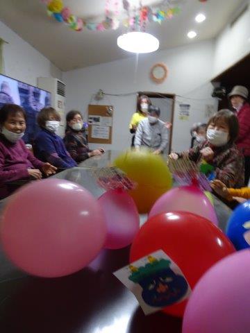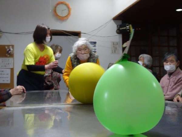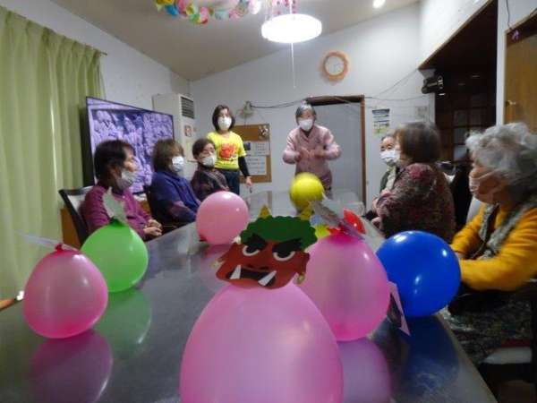 風船起き上がりこぼしに、鬼の顔を付けてボールで倒していくゲームでするんるん (音符)