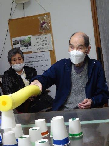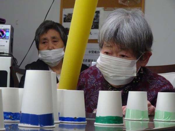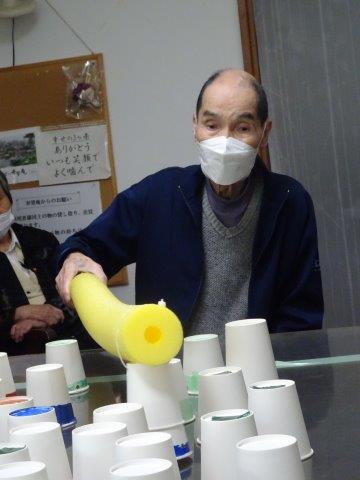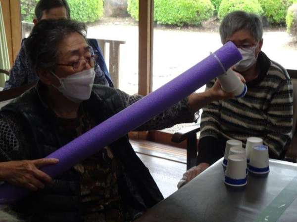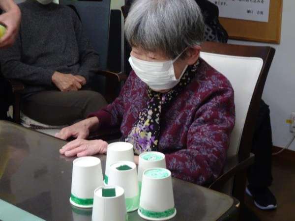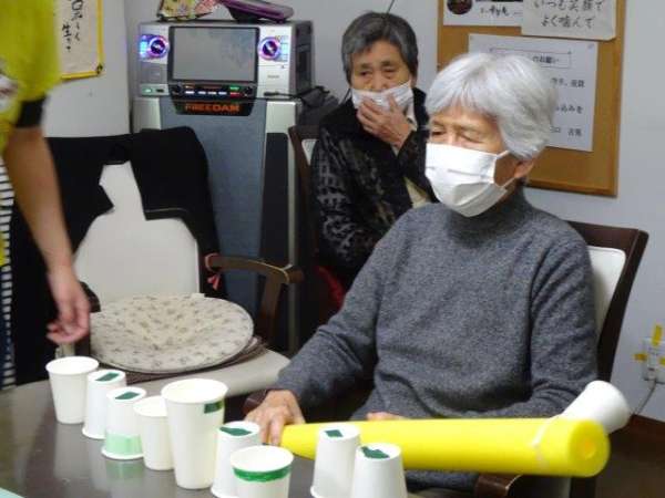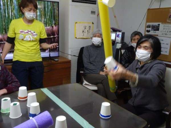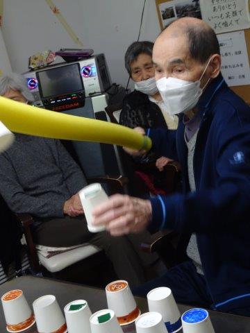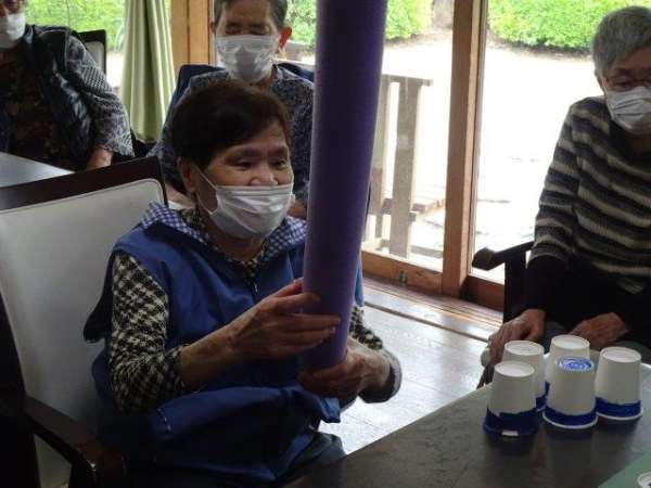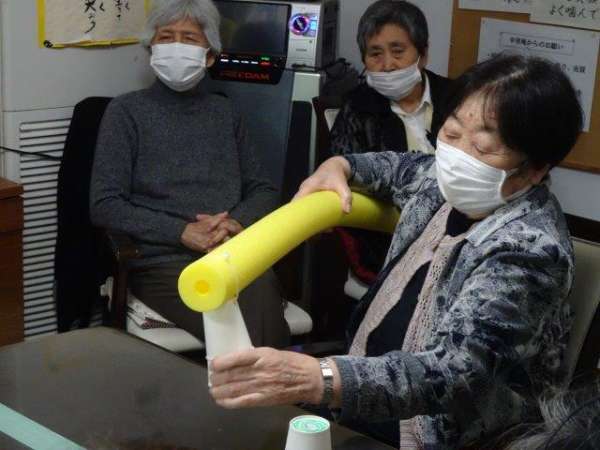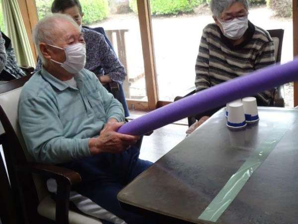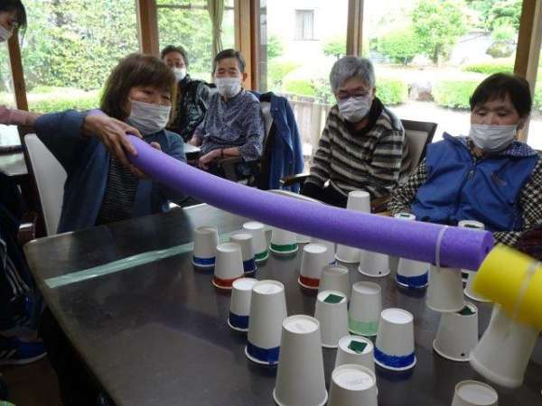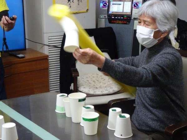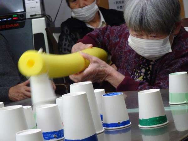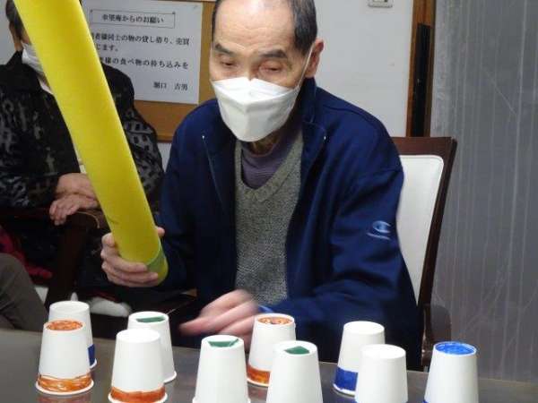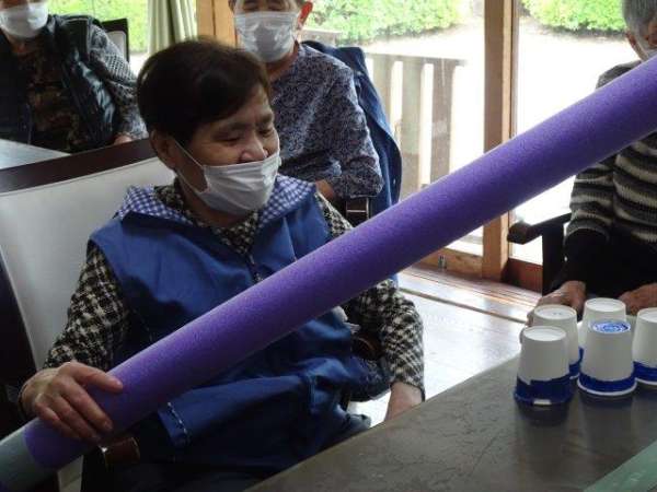 ご自分の手よりも長い棒の先にコップを付けて、指名した色のコップを取っていきましょう