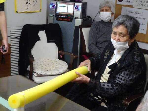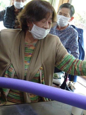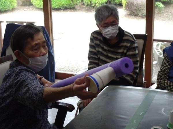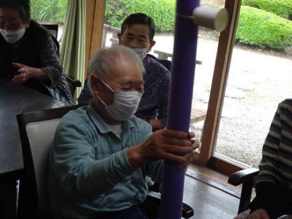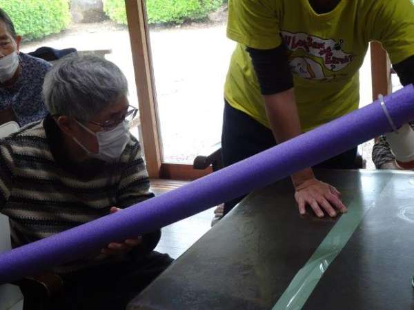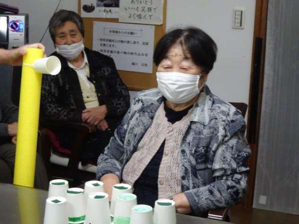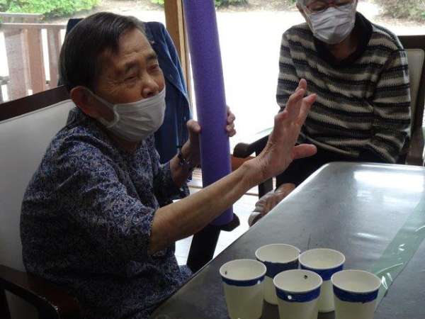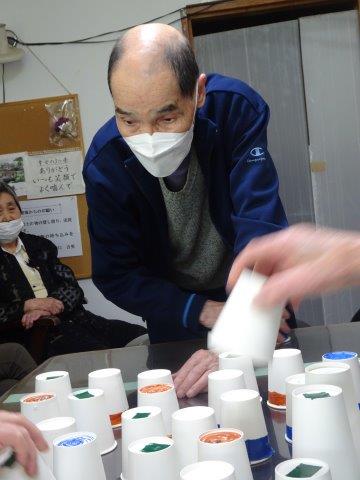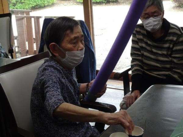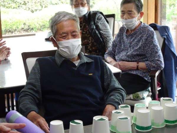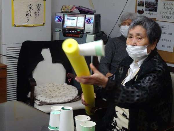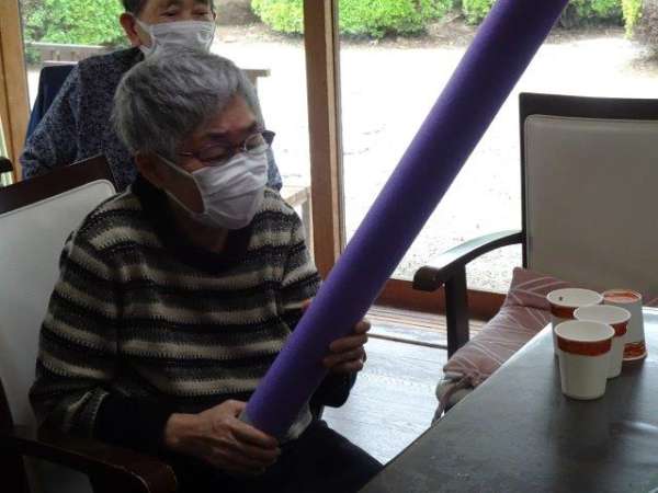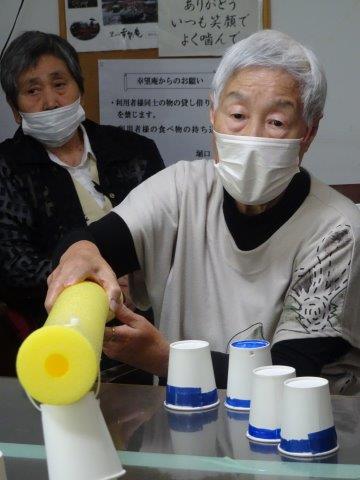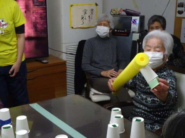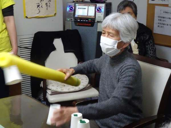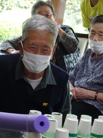 ご自分の手よりも長い棒の先にコップを付けて、指名した色のコップを取っていきましょう