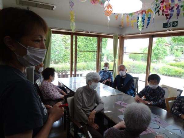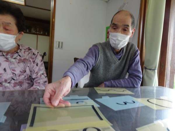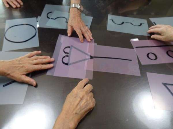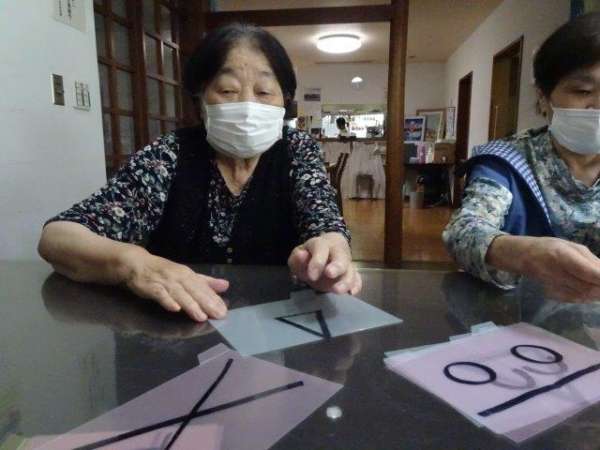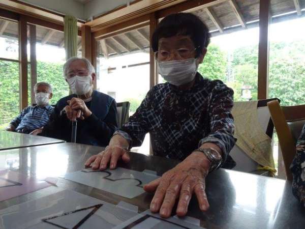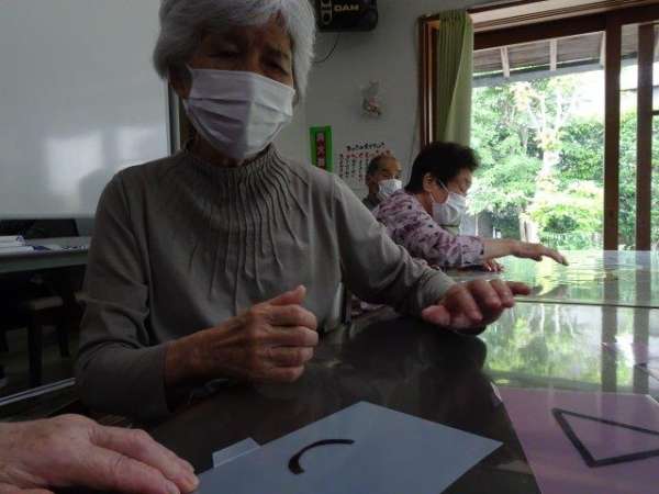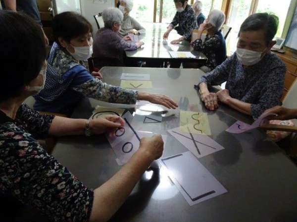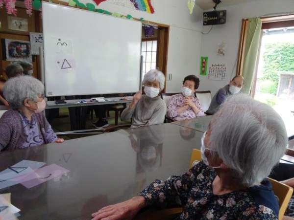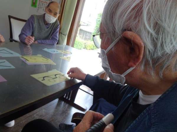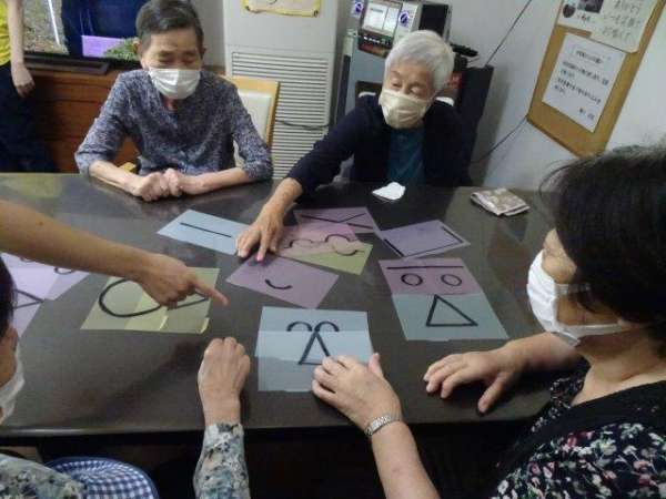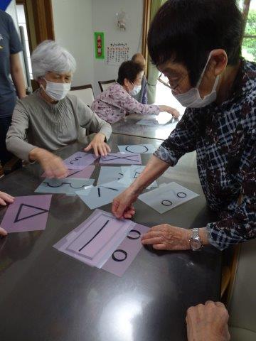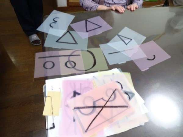 こんな形のシートを使ってスタッフが出す形の問題に組み合わせて同じ形の物を作っていく「パズル」です