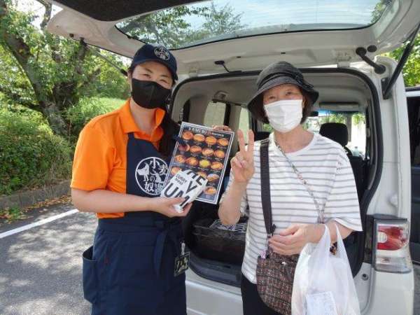 優しい移動販売のお姉さま一緒にハイポーズわーい (嬉しい顔)
