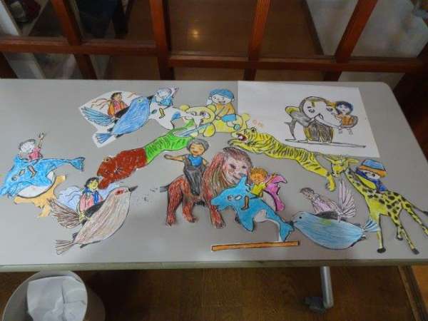 自分が色塗り切り取りした動物たちに、自分が乗っちゃうようです