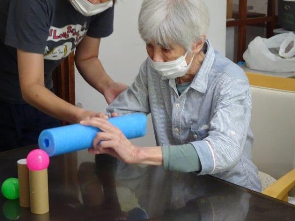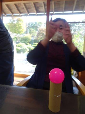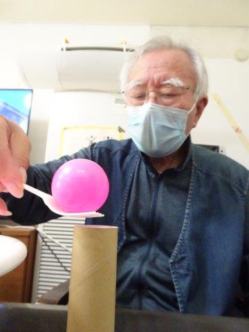 最後は、向かい合ったお二人で、息を合わせてボールをすくい上げてのせましょう