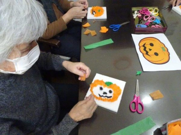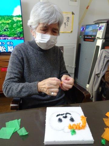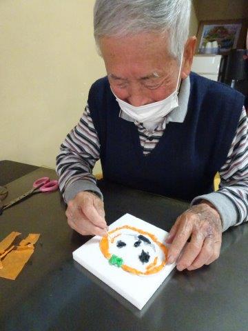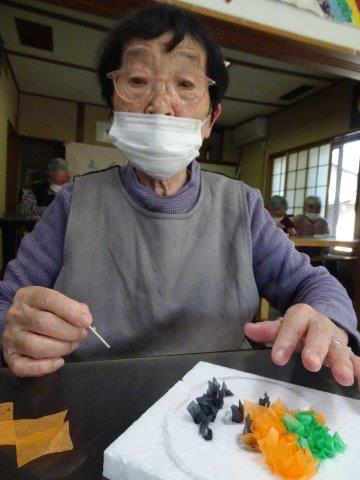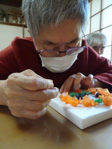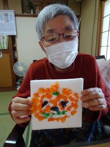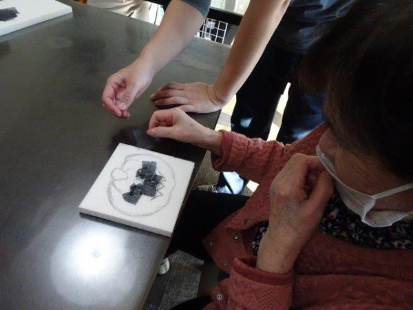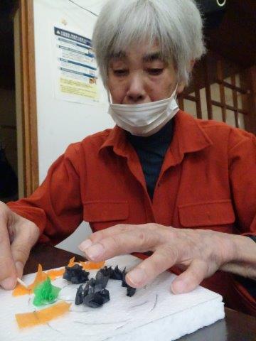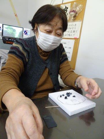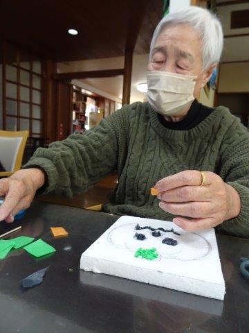 小さく切った紙ペーパーを発泡スチロールの絵に合わせて