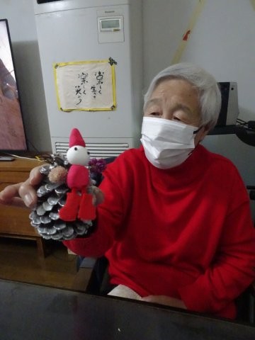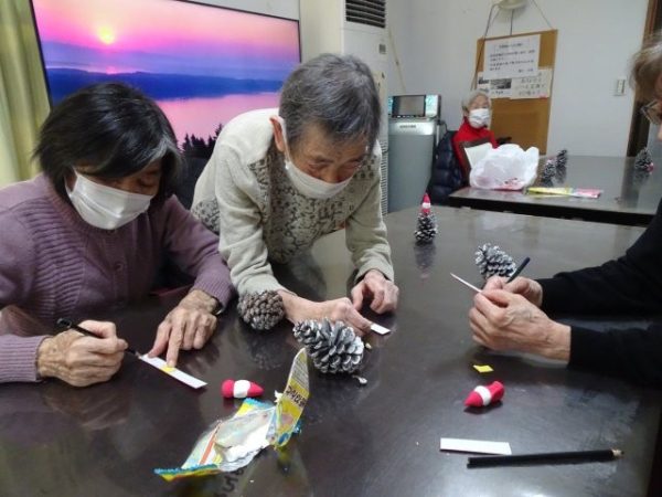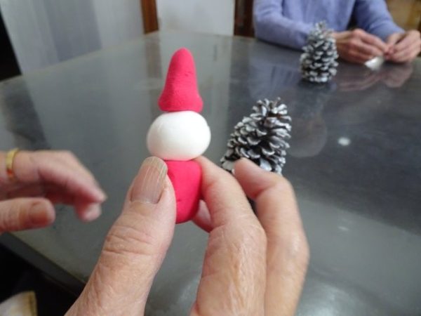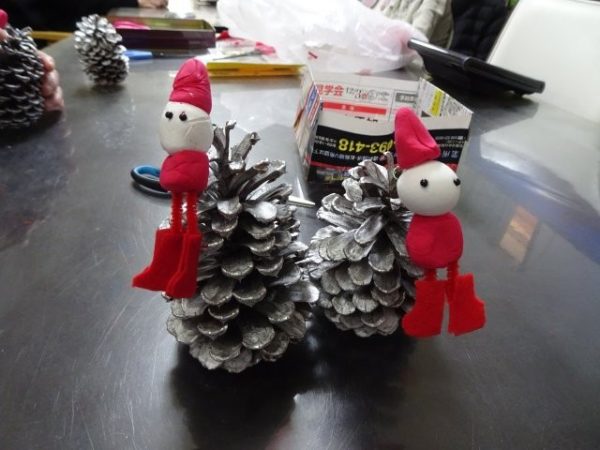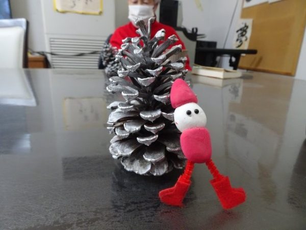 銀色に加工した松ぼっくりをクリスマスツリーにみたて、紙粘土でサンタさんの飾りを作って