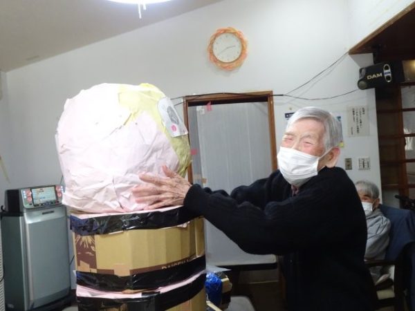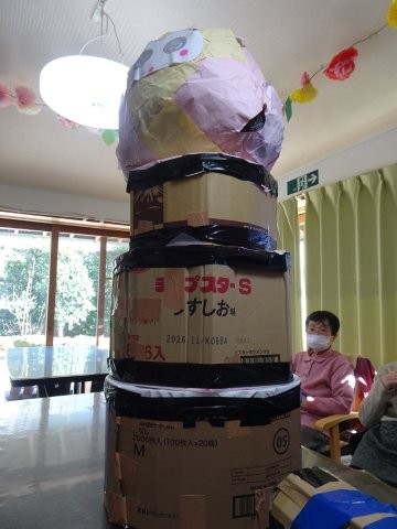 今日は、昨年皆様が作ってくださった巨大だるまを使って「だるま落とし」にチャレンジ