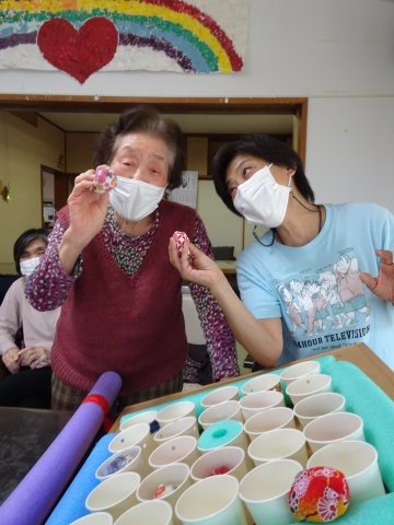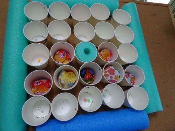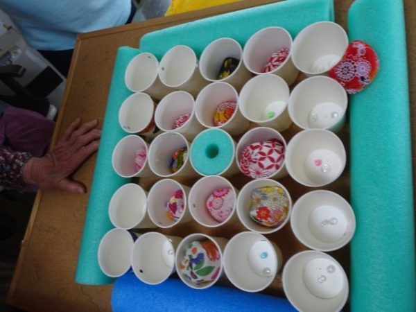 紙コップを並べ、ビンゴ形式でチャレンジ