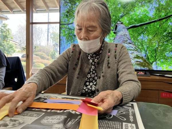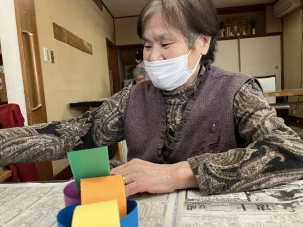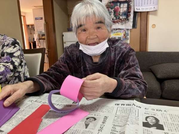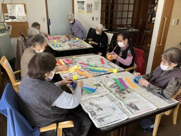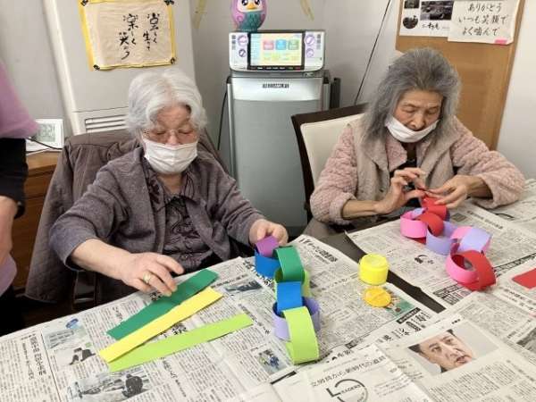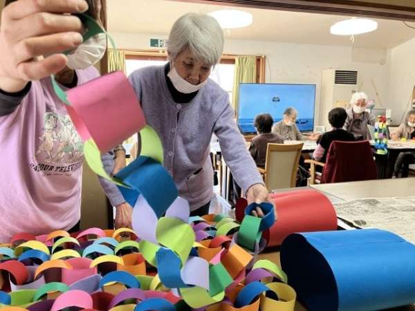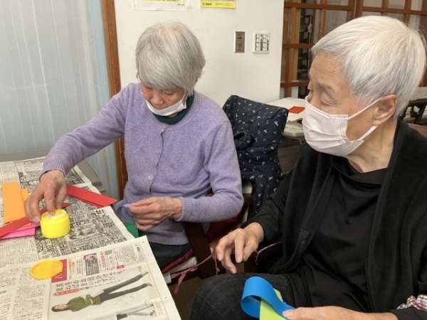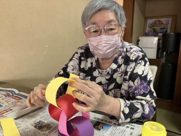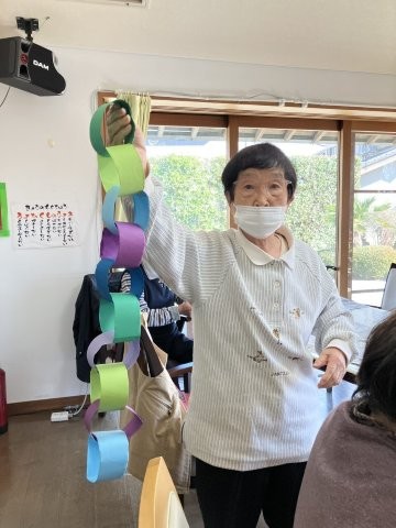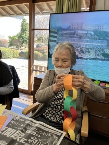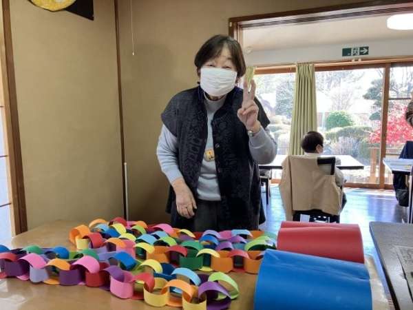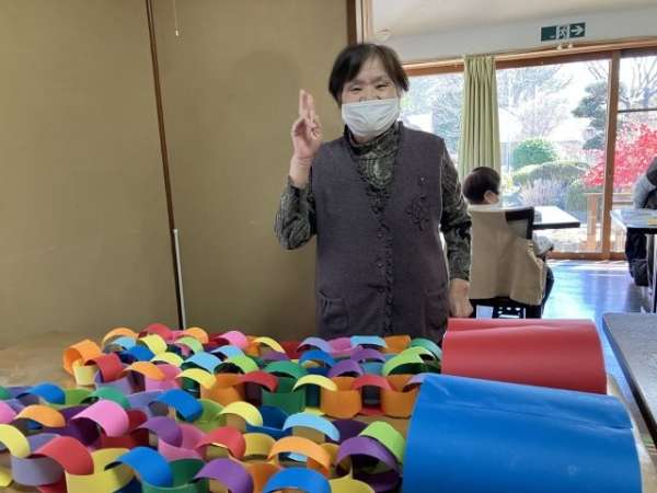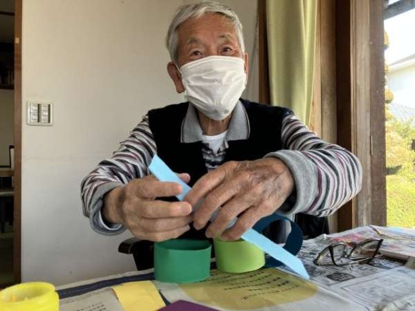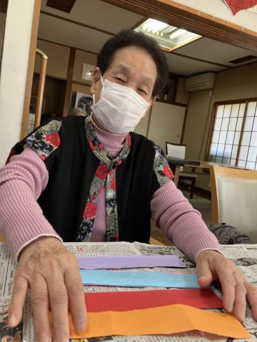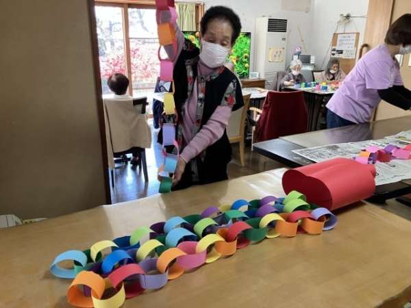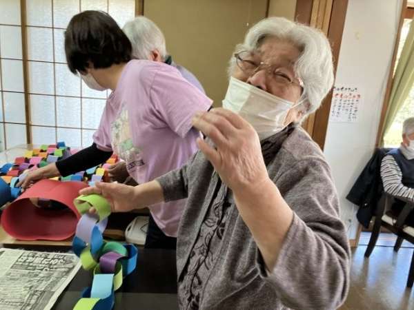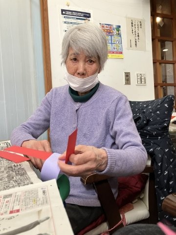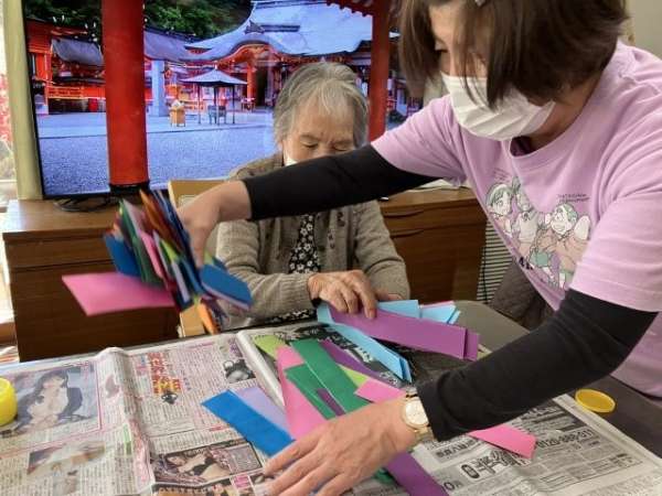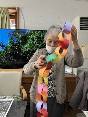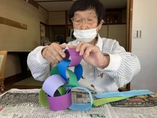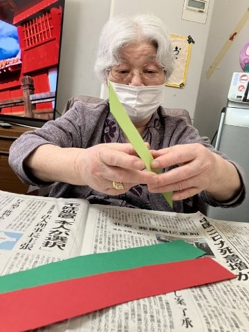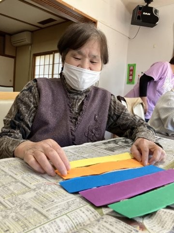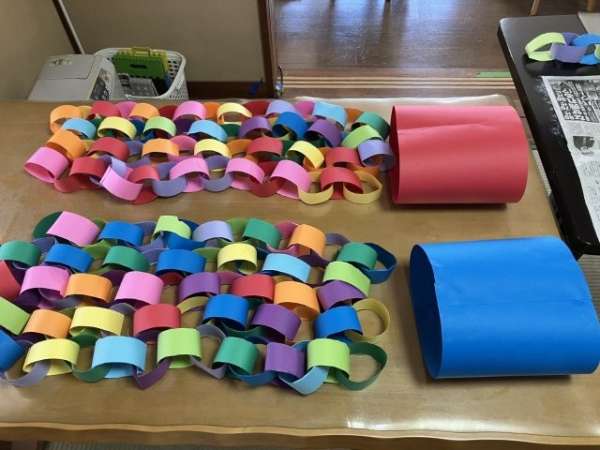 色とりどりの画用紙を細く切り、わっかつなげこいのぼりの体を作っていきます