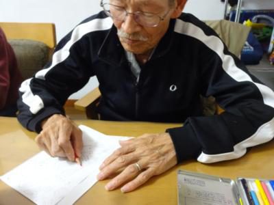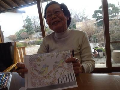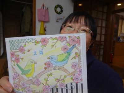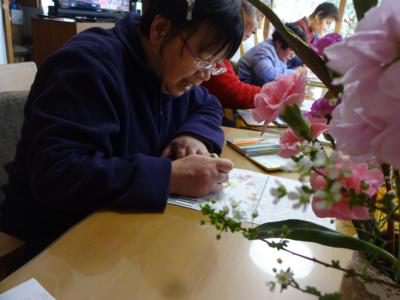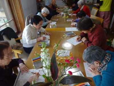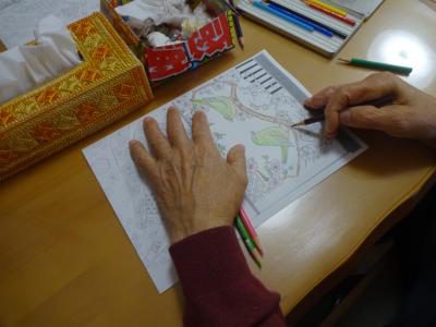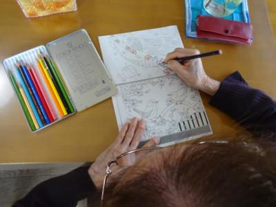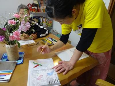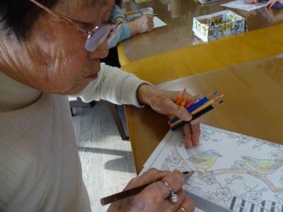 今日のレクは春を感じるぬり絵をしましょうね✎
