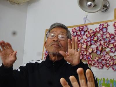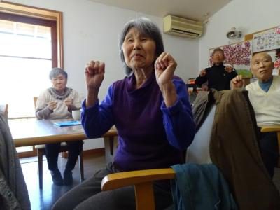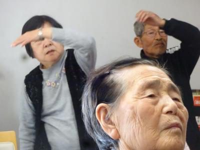 ラジオ体操、脇腹をしっかりと伸ばして~~