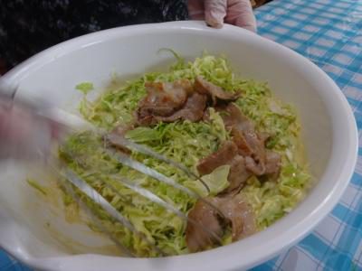 ベースの生地にキャベツの千切り焼いたお肉投入
