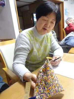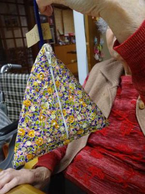 朝の会が終わり、お母さんが三角ポーチを作ってきた