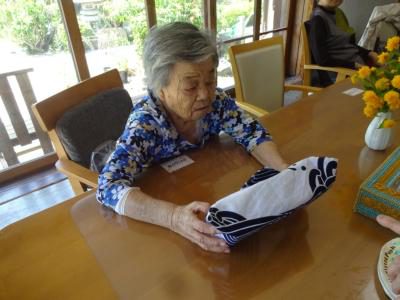 ↑浴衣の生地を使ったティッシュカバーを見せてもらい、「よく出来てるね