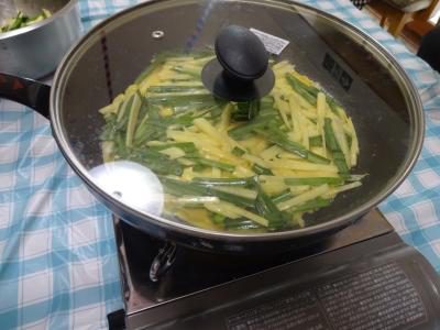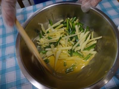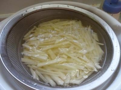 ↑綺麗に千切りしたジャガイモを水に浸してから・・・