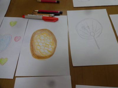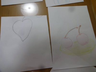 えんぴつで下書きしたら、色鉛筆で色も塗って頂きます