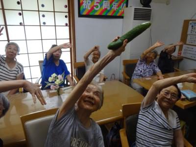 何故かキュウリを持っての体操に冷や汗 (顔)