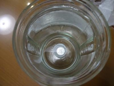 花瓶の中のキャップに一円玉を入れますよわーい (嬉しい顔)