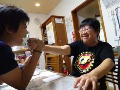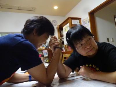 スタッフと腕相撲